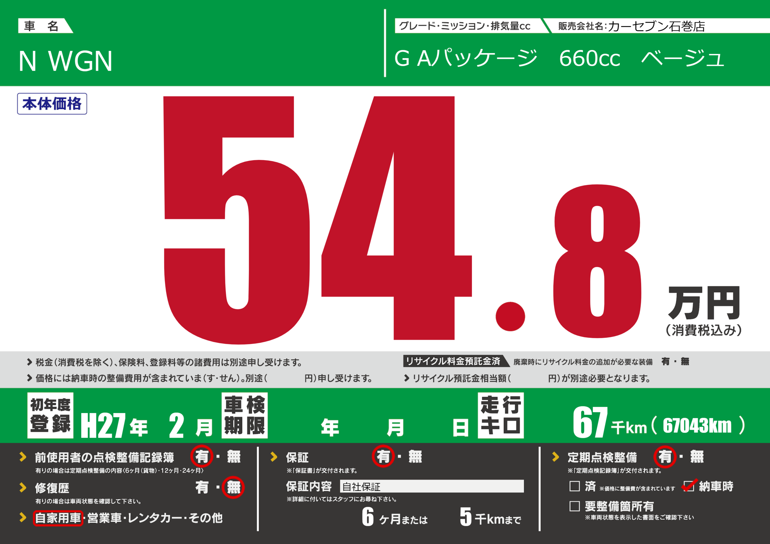 | 車名 | N WGN | グレード ミッション 排気量 |