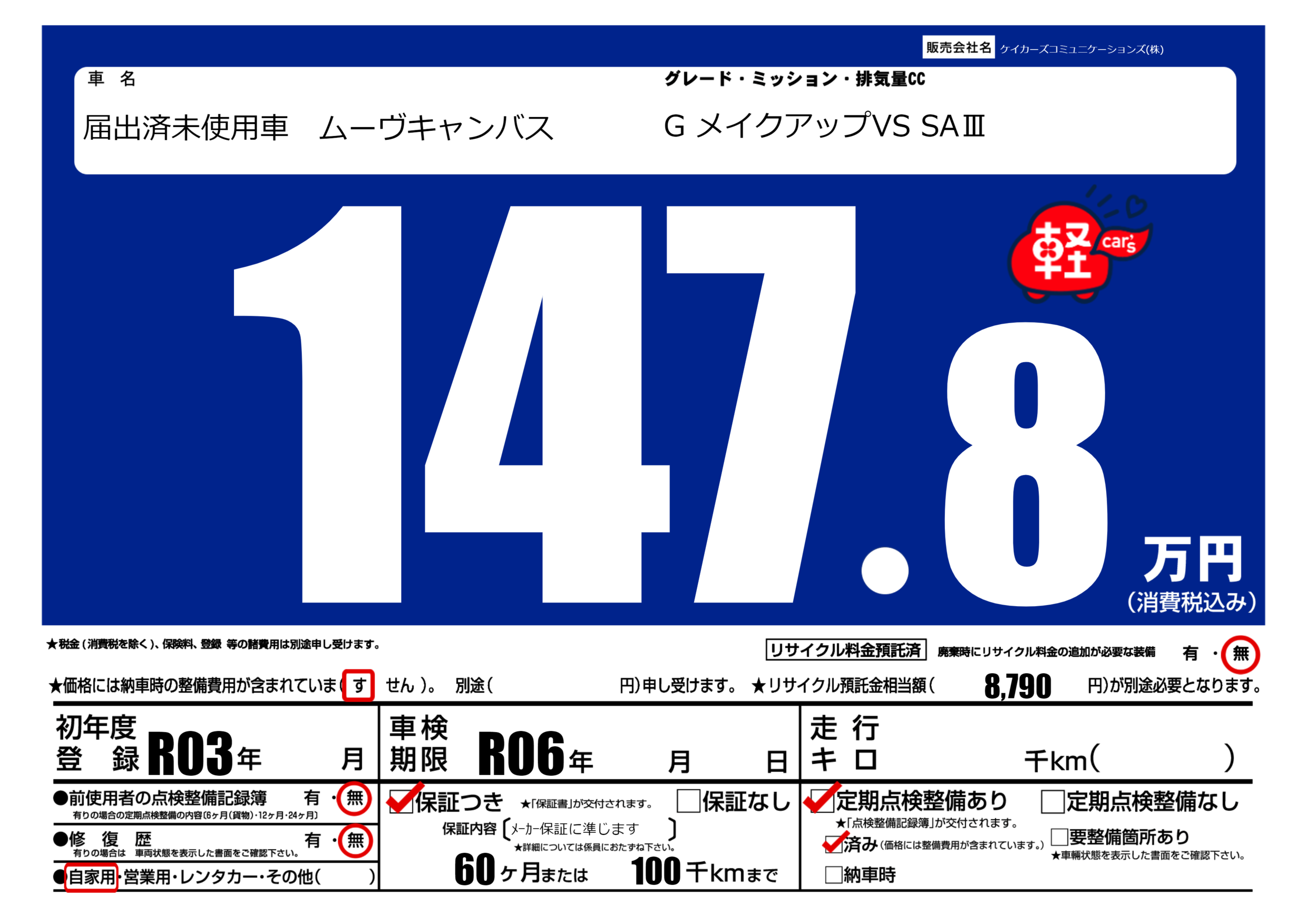 | 定期点検整備 | 定期点検整備あり 定期点検整備済み | ||