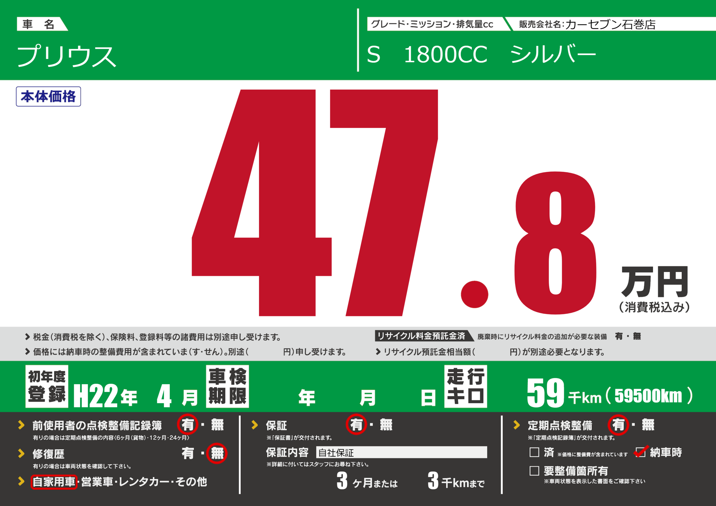 | 車名 | プリウス | グレード ミッション 排気量 |