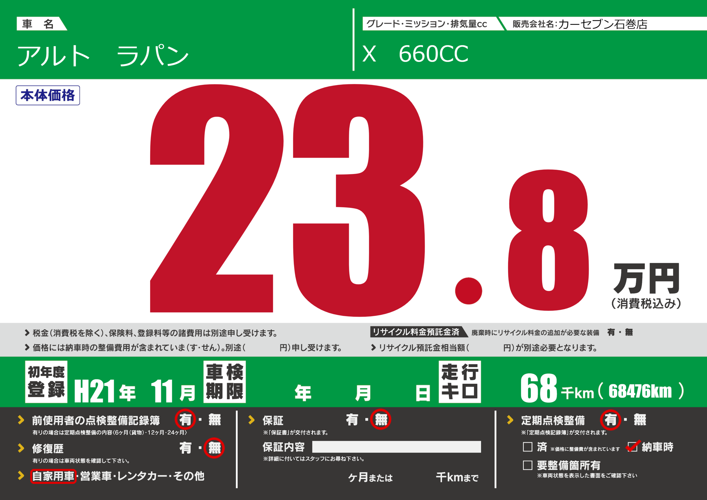 | 車名 | アルト ラパン | グレード ミッション 排気量 |