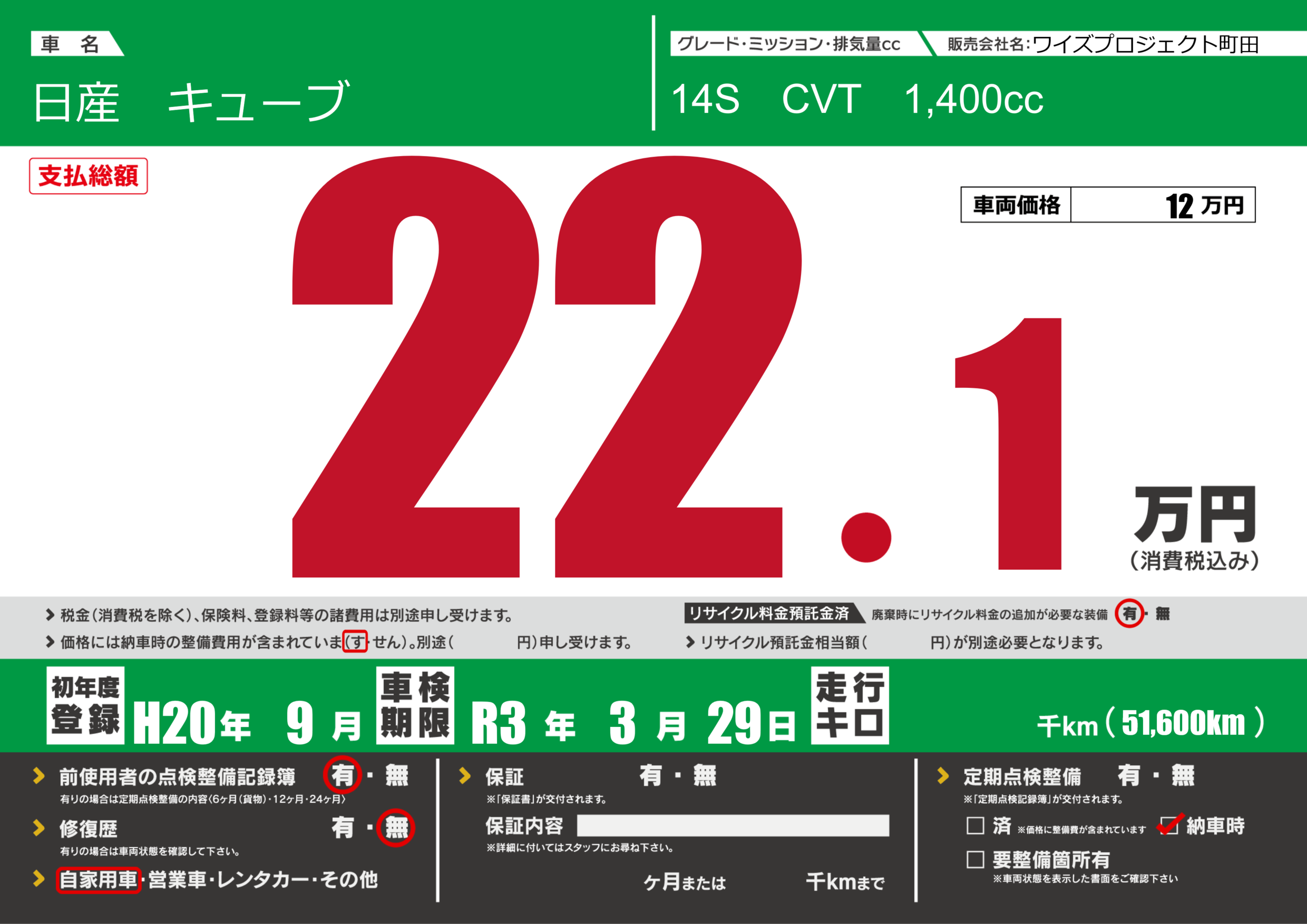 | 車名 | 日産 キューブ | グレード ミッション 排気量 |