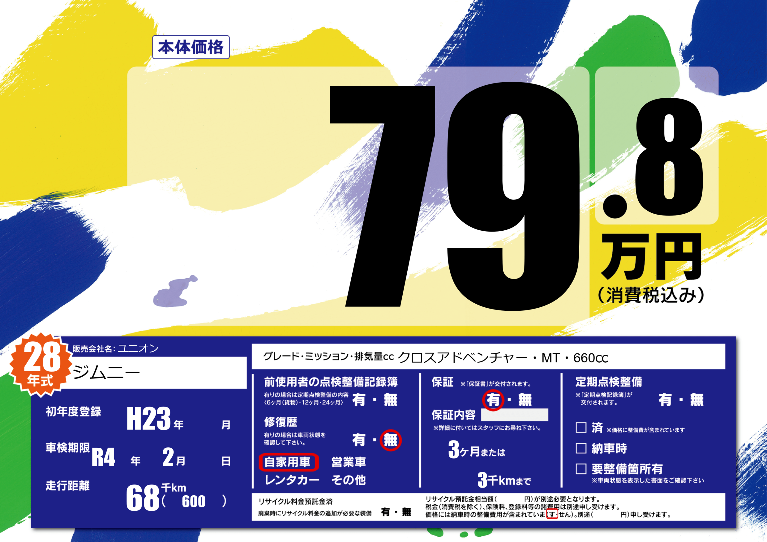 | 車名 | ジムニー | グレード ミッション 排気量 |