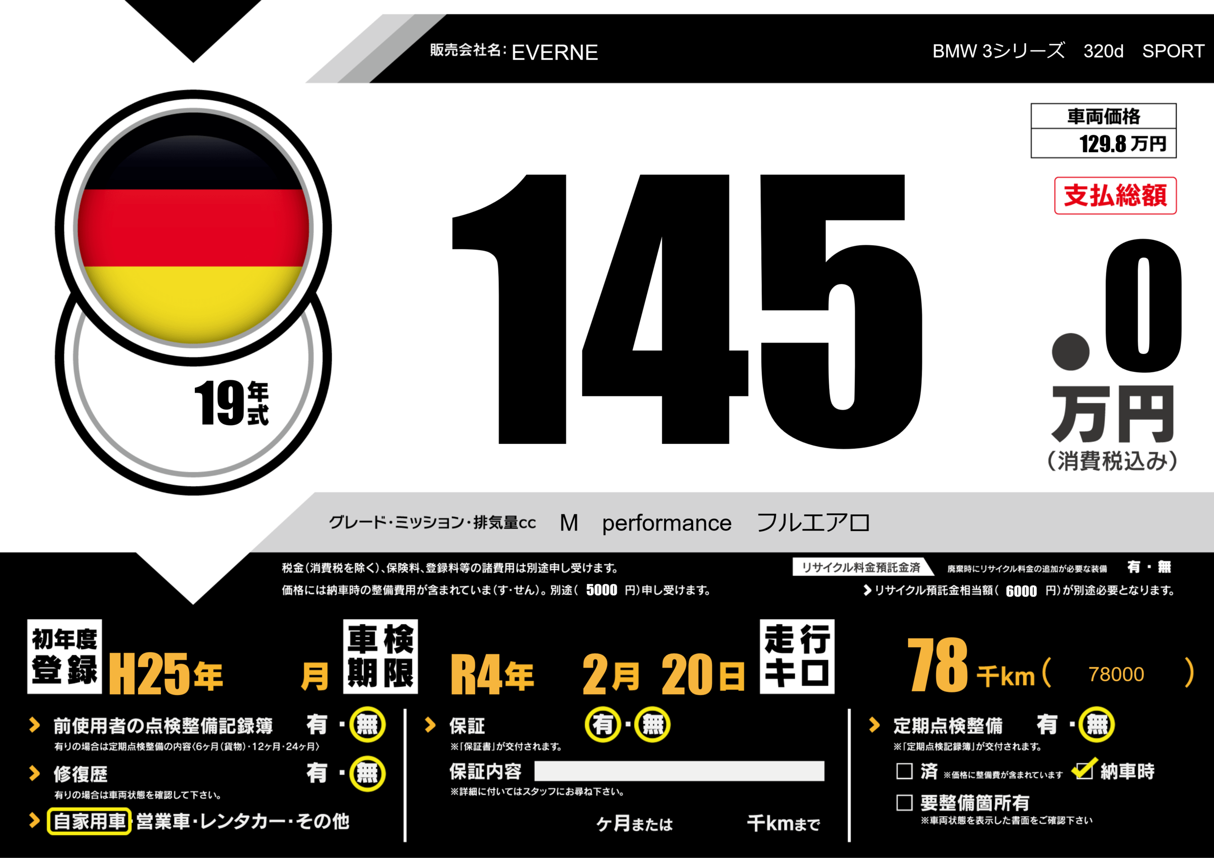 | 車名 | BMW 3シリーズ 320d SPORT | グレード ミッション 排気量 |