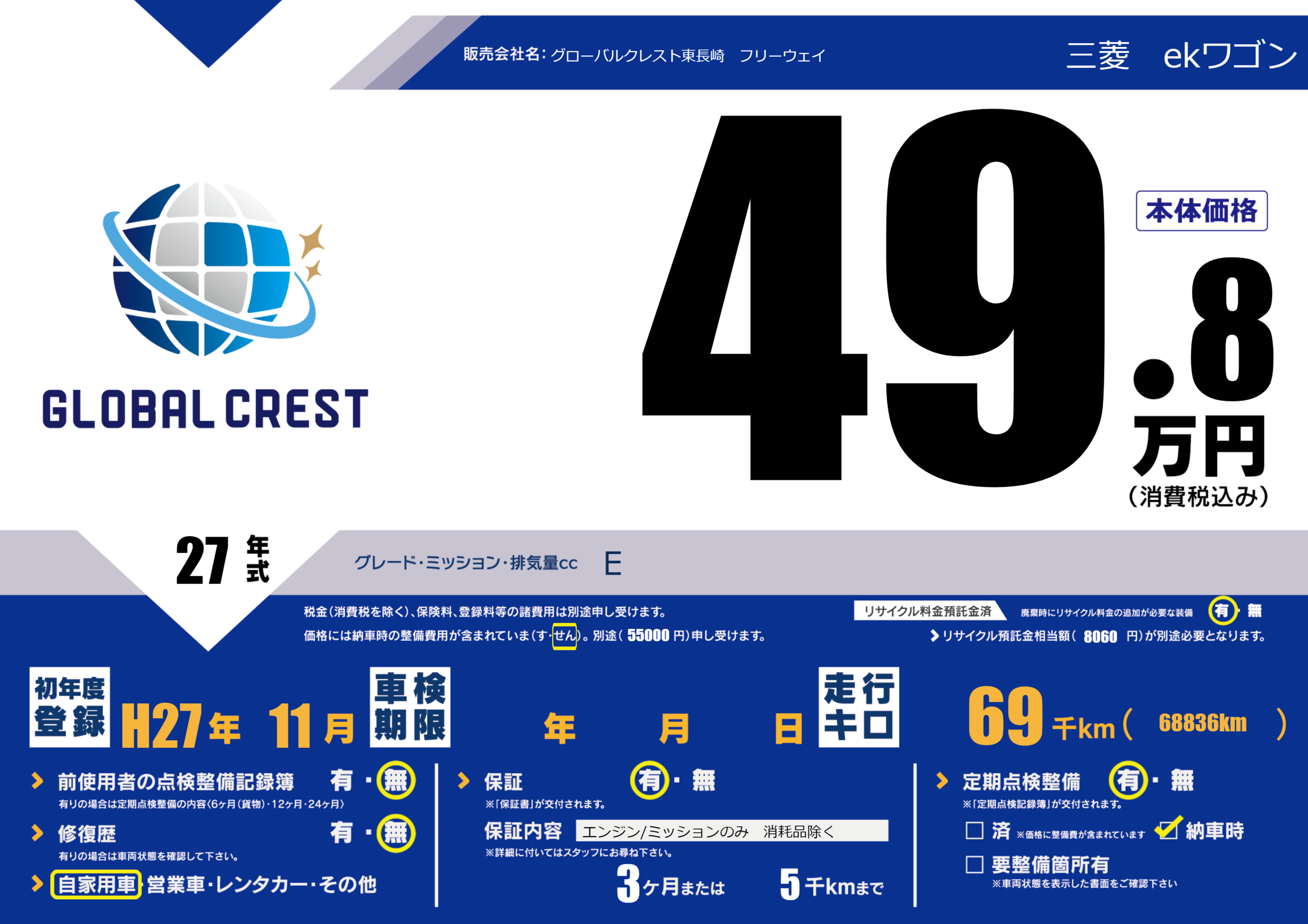 | 車名 | 三菱 ekワゴン | グレード ミッション 排気量 |
