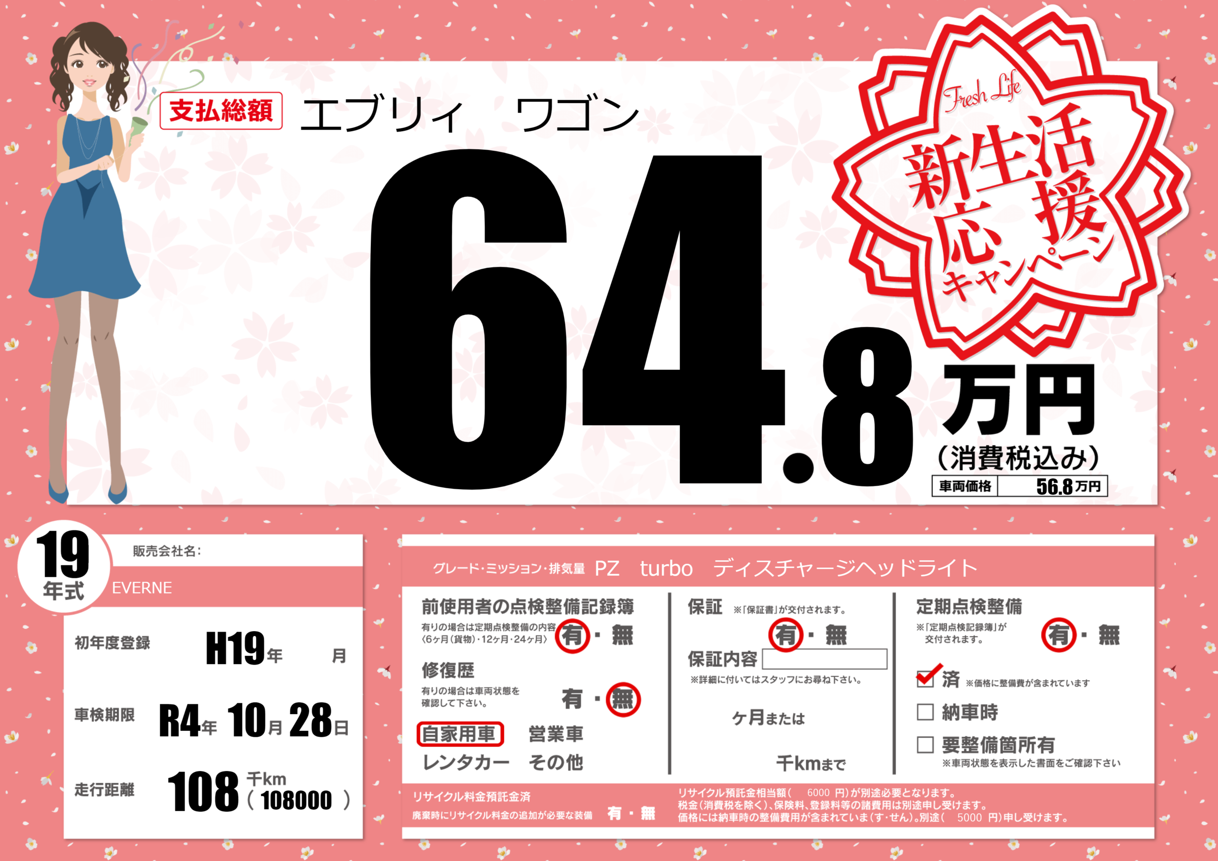 | 車名 | エブリィ ワゴン | グレード ミッション 排気量 |