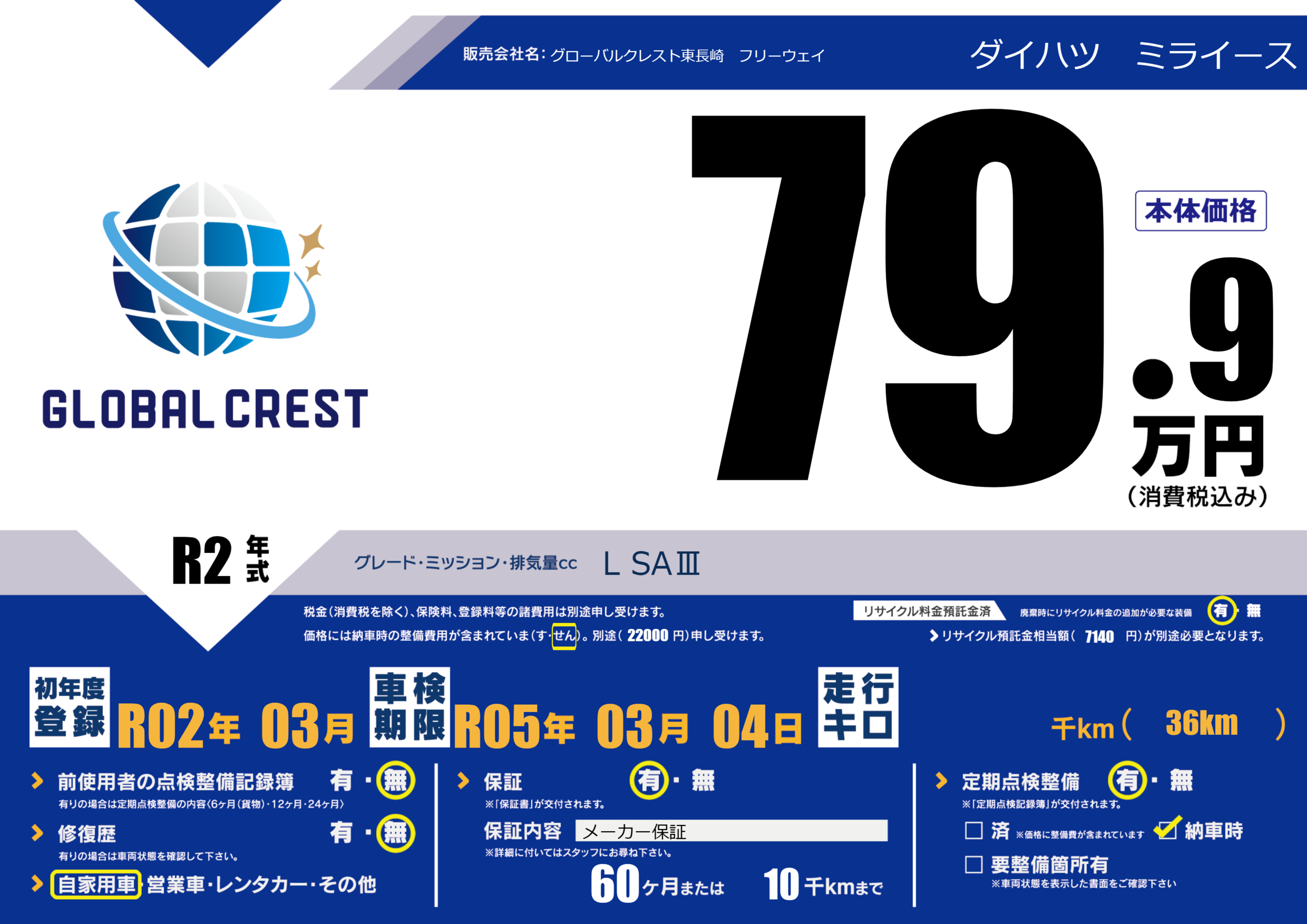 | 走行キロ | - | 初年度登録 | R02年03月 |