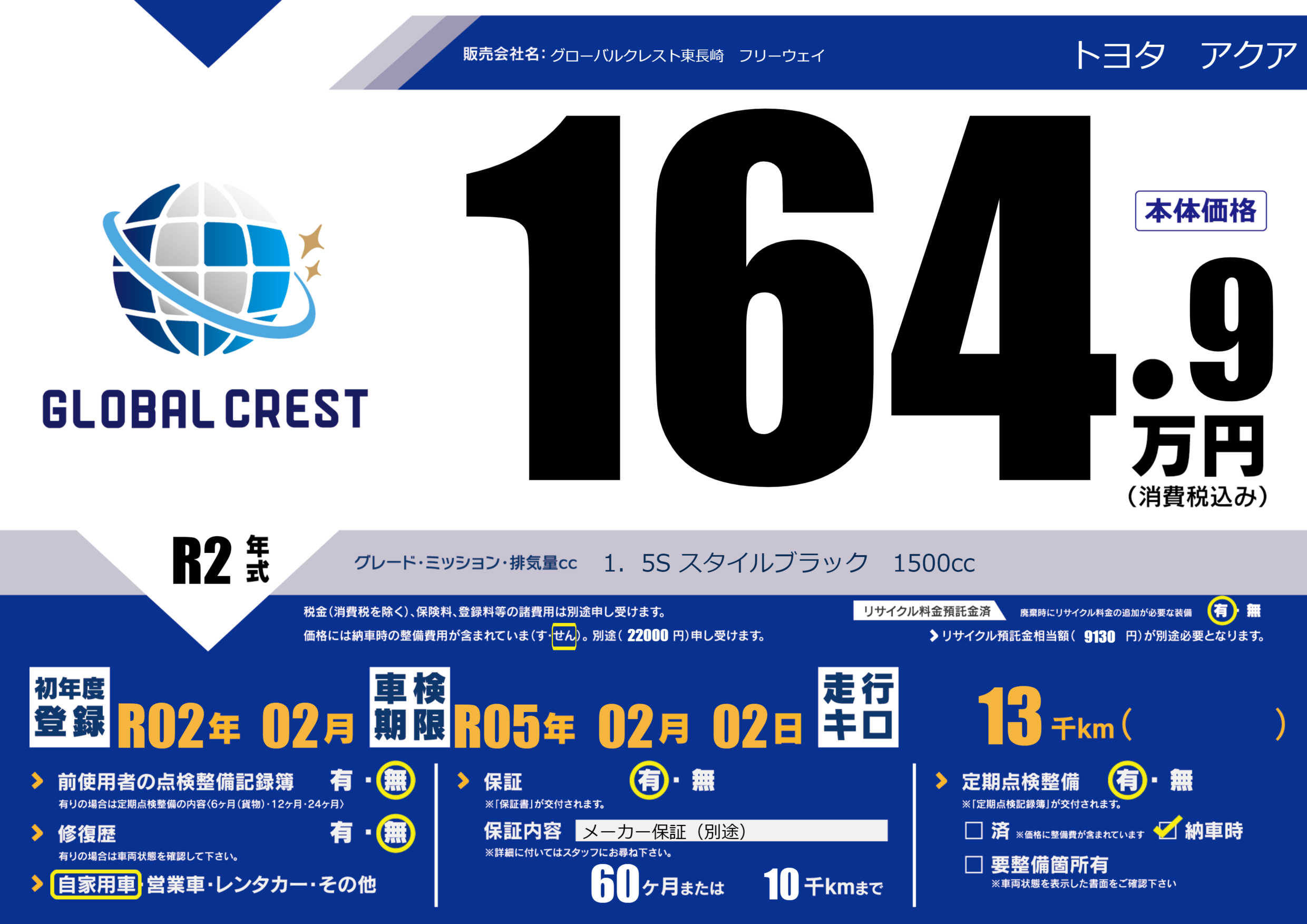 | 車名 | トヨタ アクア | グレード ミッション 排気量 |