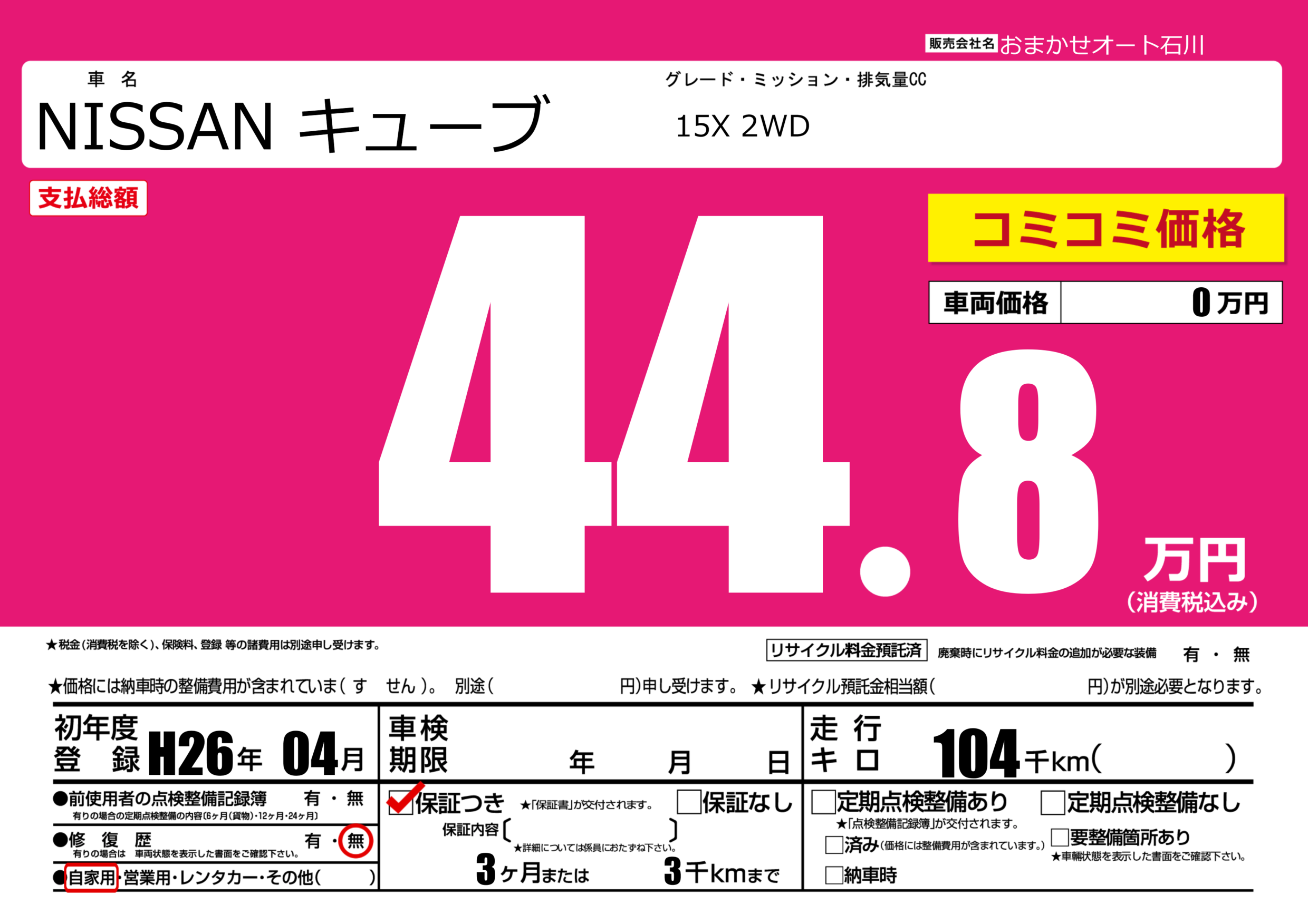 | 車名 | NISSAN キューブ | グレード ミッション 排気量 |