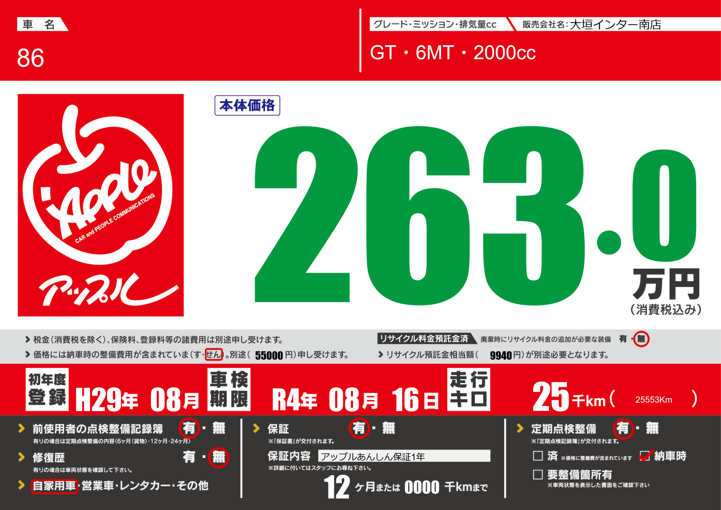| 定期点検整備 | 定期点検整備あり 納車時あり | ||