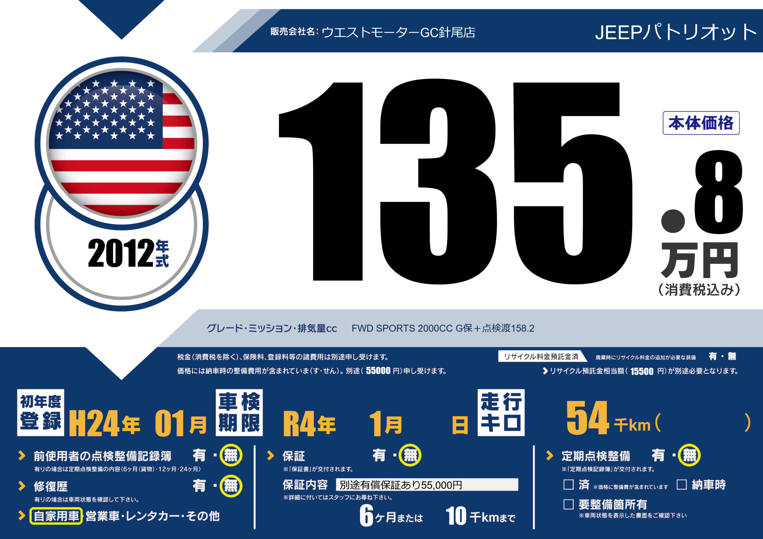 | 車名 | JEEPパトリオット | グレード ミッション 排気量 |