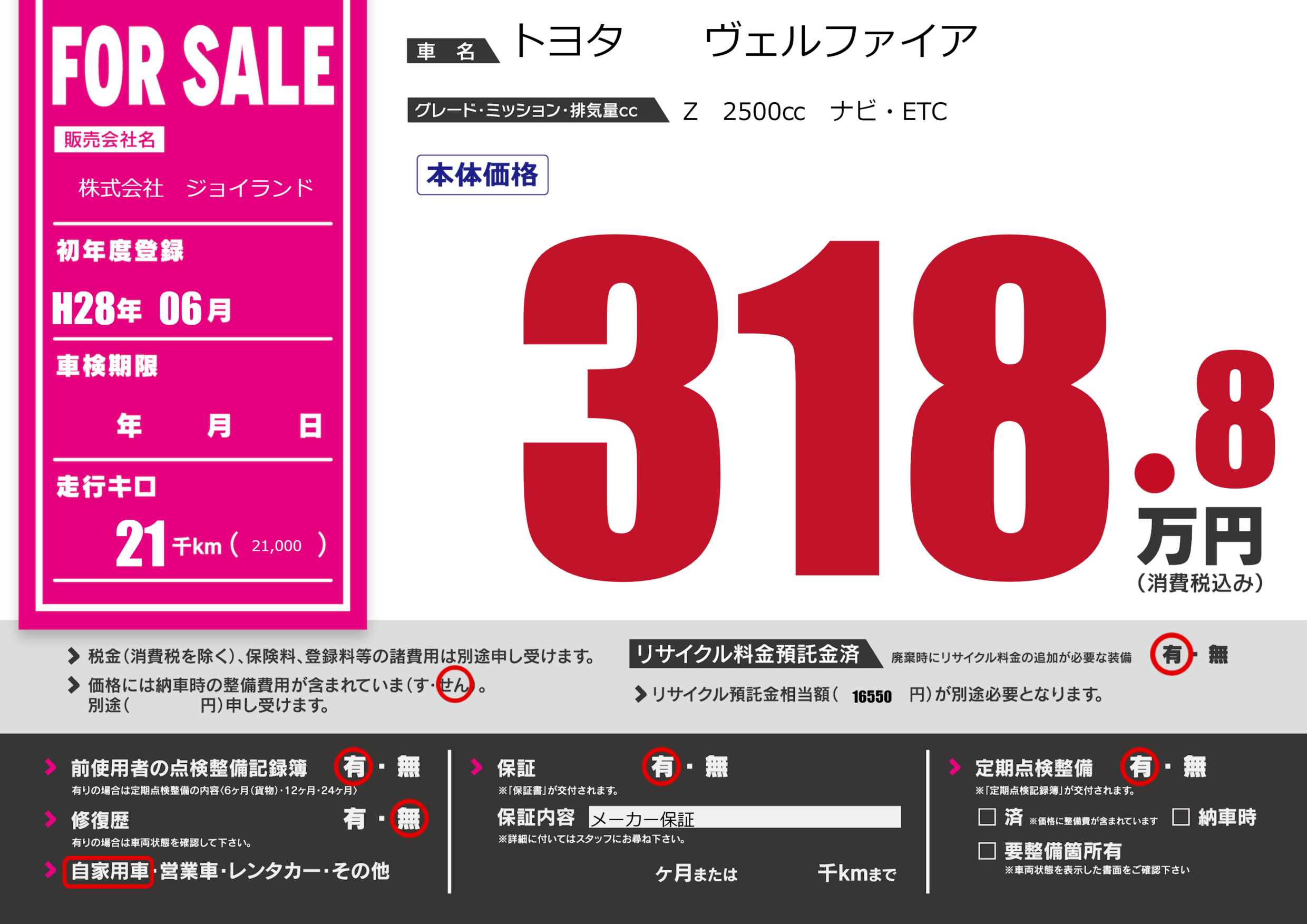 | 車名 | トヨタ ヴェルファイア | グレード ミッション 排気量 |