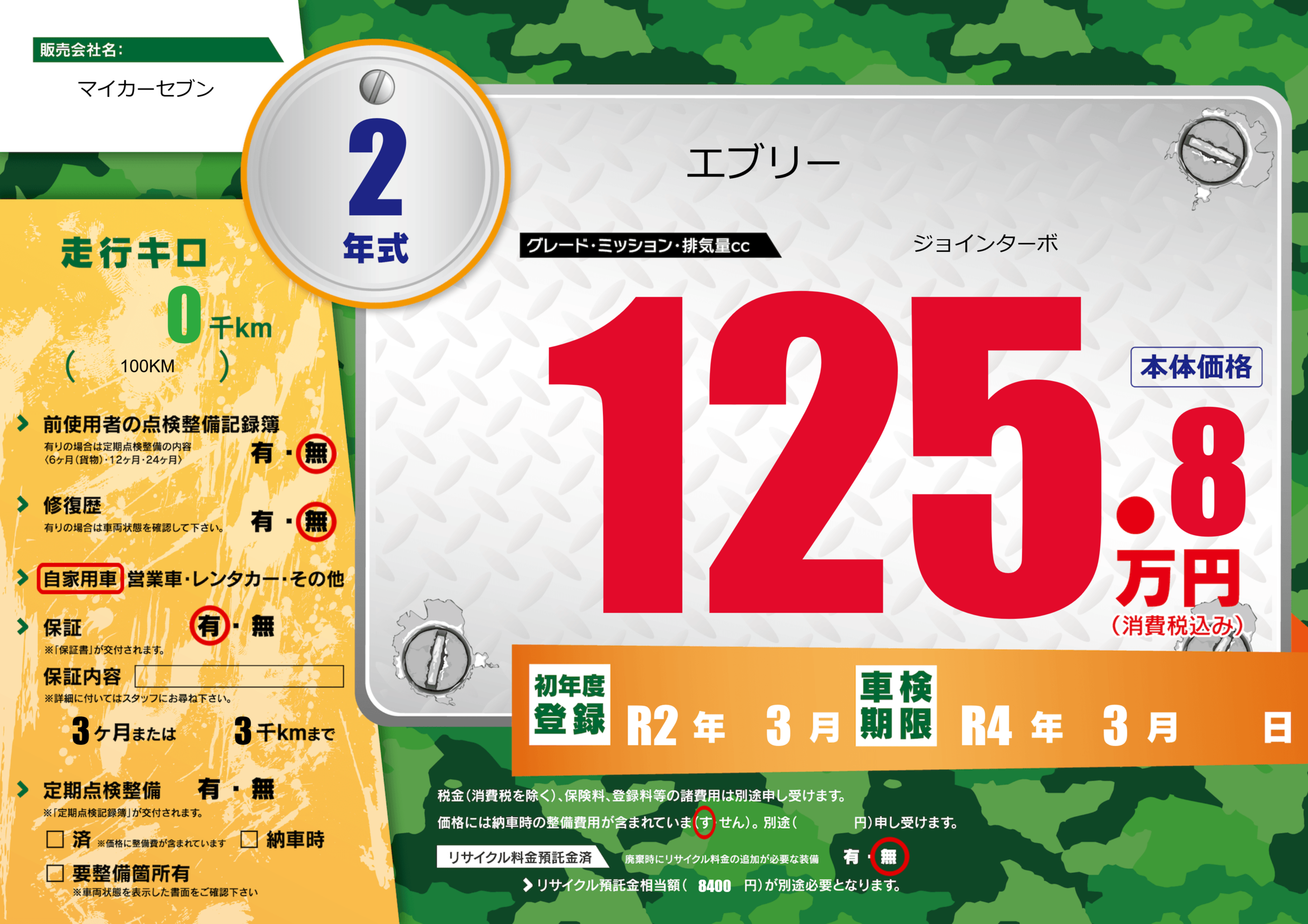 | 車検制限 | R4年 3月 - 日 | ||