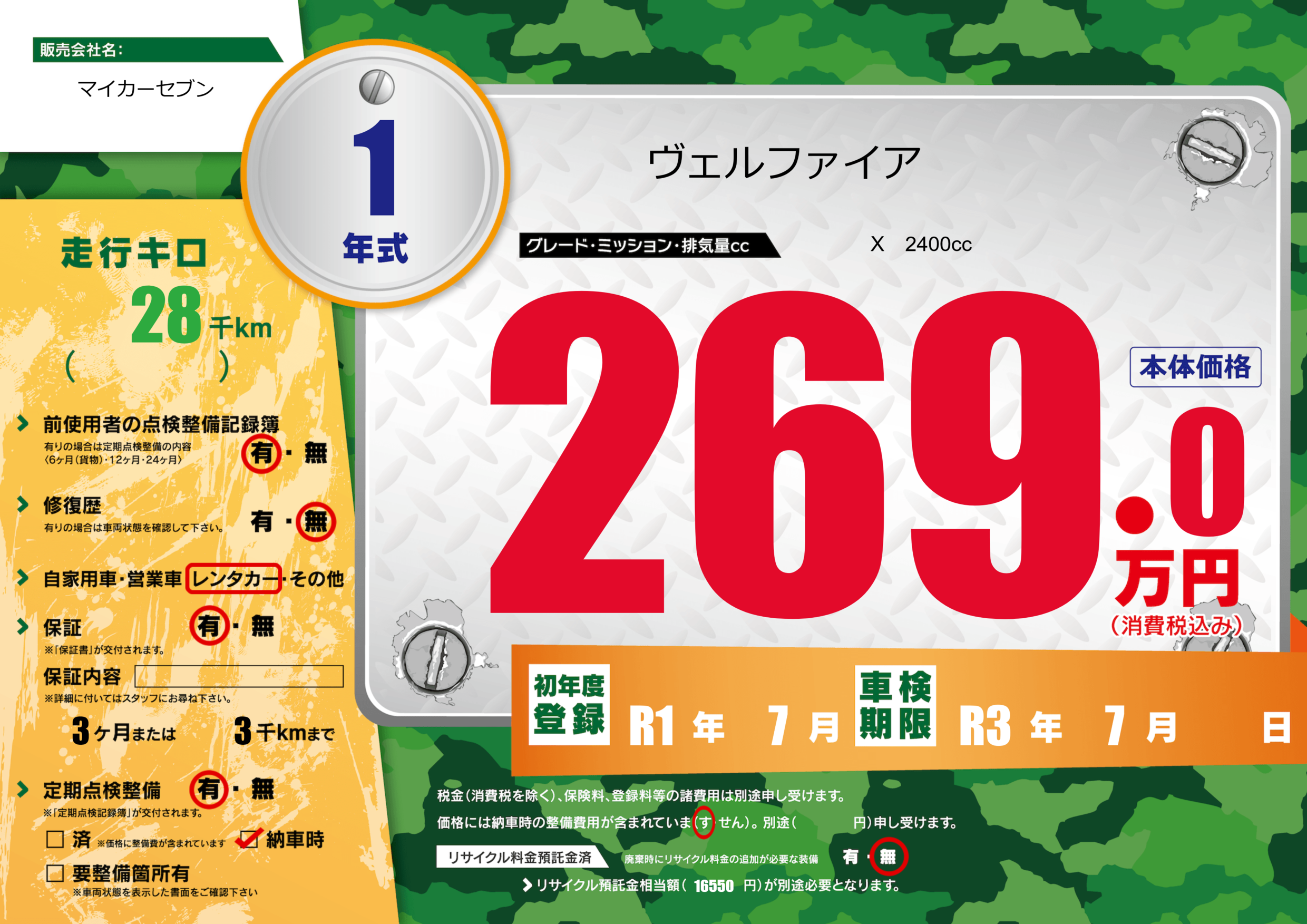 | 車名 | ヴェルファイア | グレード ミッション 排気量 |