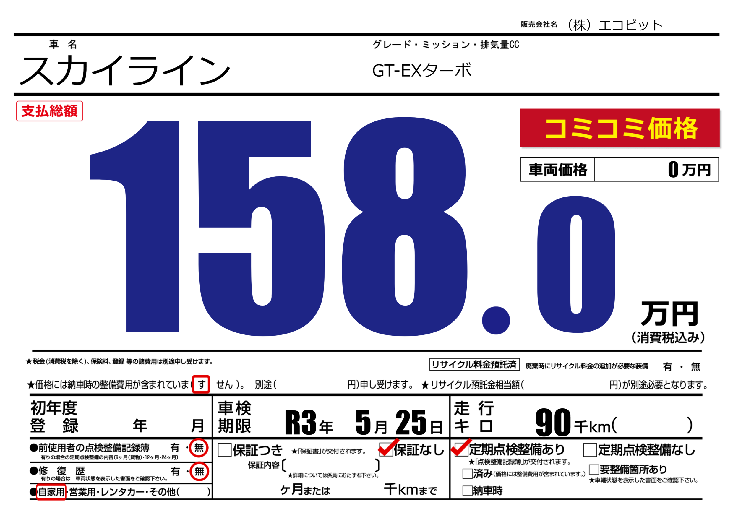 | 車名 | スカイライン | グレード ミッション 排気量 |