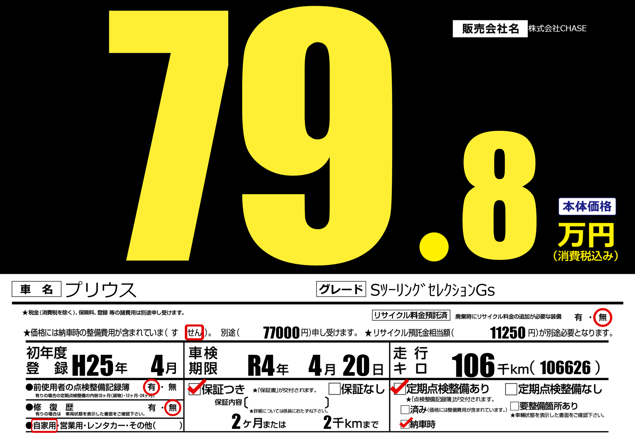 | 車名 | プリウス | グレード ミッション 排気量 |