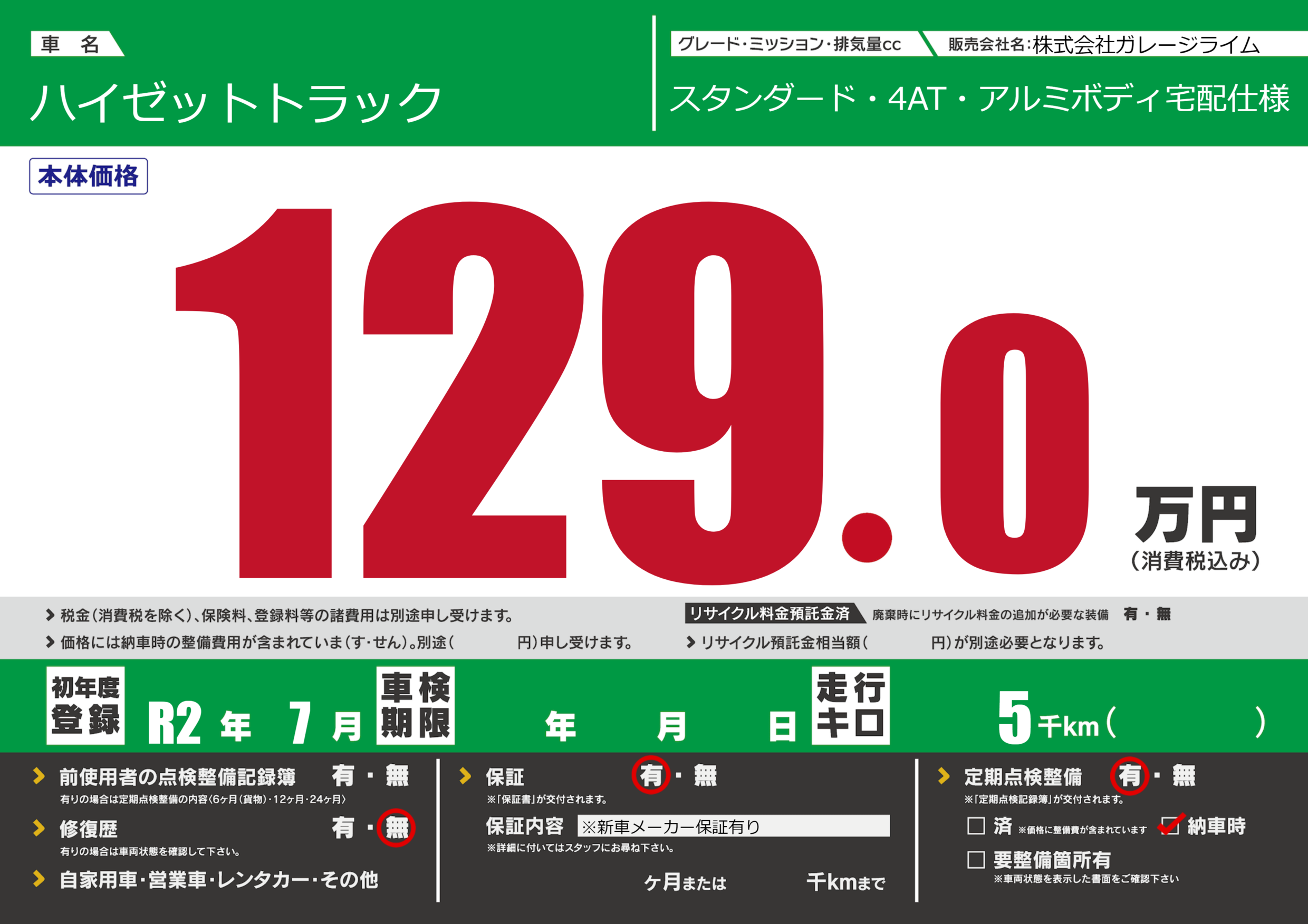 保証付き 保証内容(※新車メーカー保証有り) ヶ月または千km |