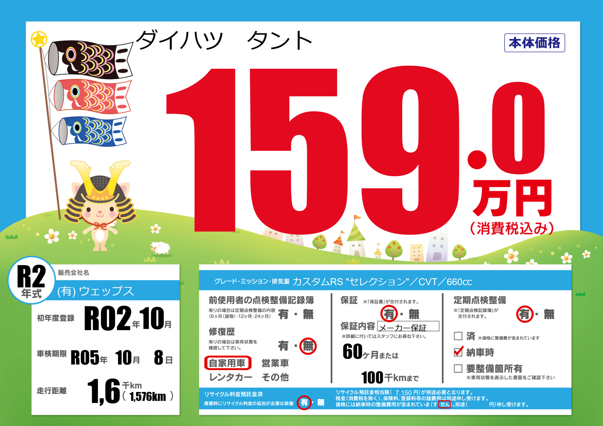 | 車名 | ダイハツ タント | グレード ミッション 排気量 |