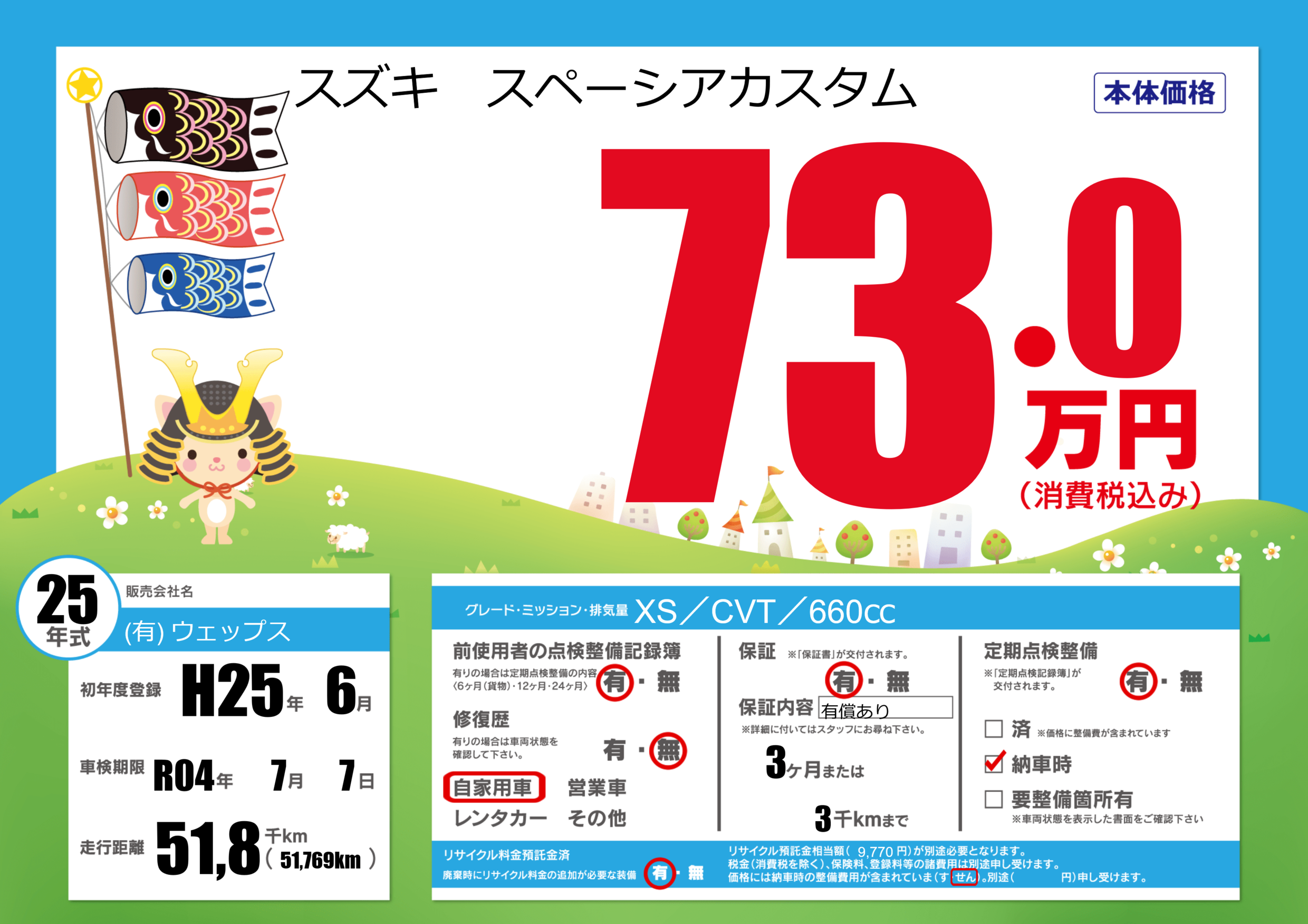 | 車名 | スズキ スペーシアカスタム | グレード ミッション 排気量 |