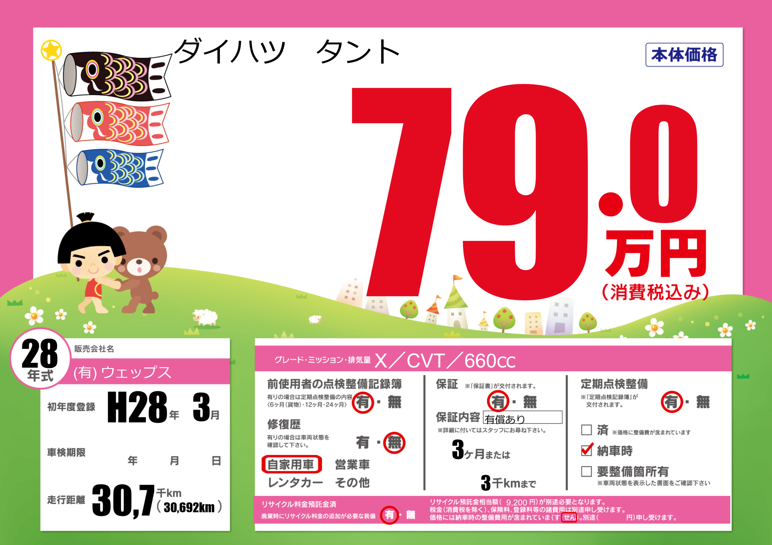 | 車名 | ダイハツ タント | グレード ミッション 排気量 |
