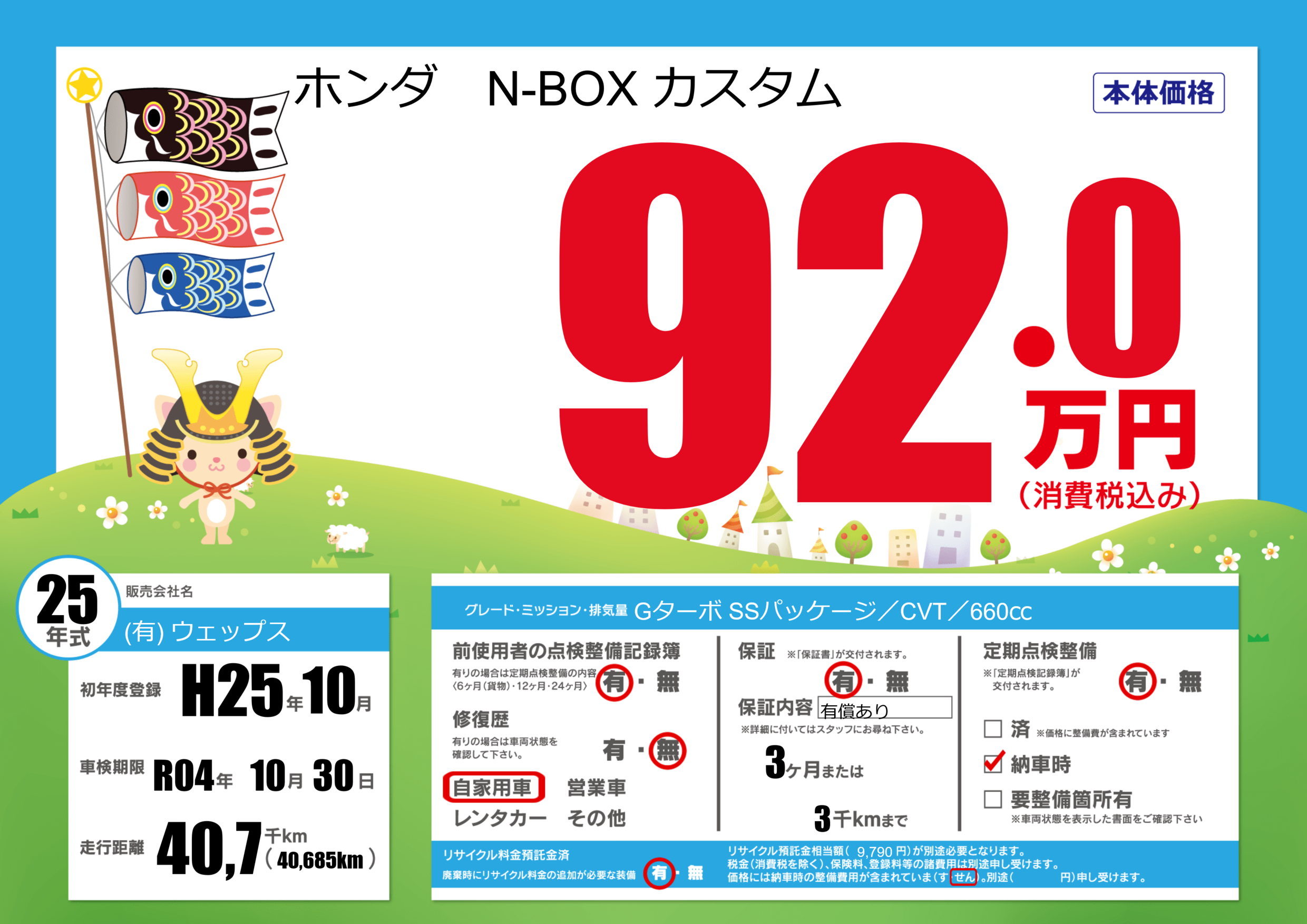 | 車名 | ホンダ N-BOX カスタム | グレード ミッション 排気量 |