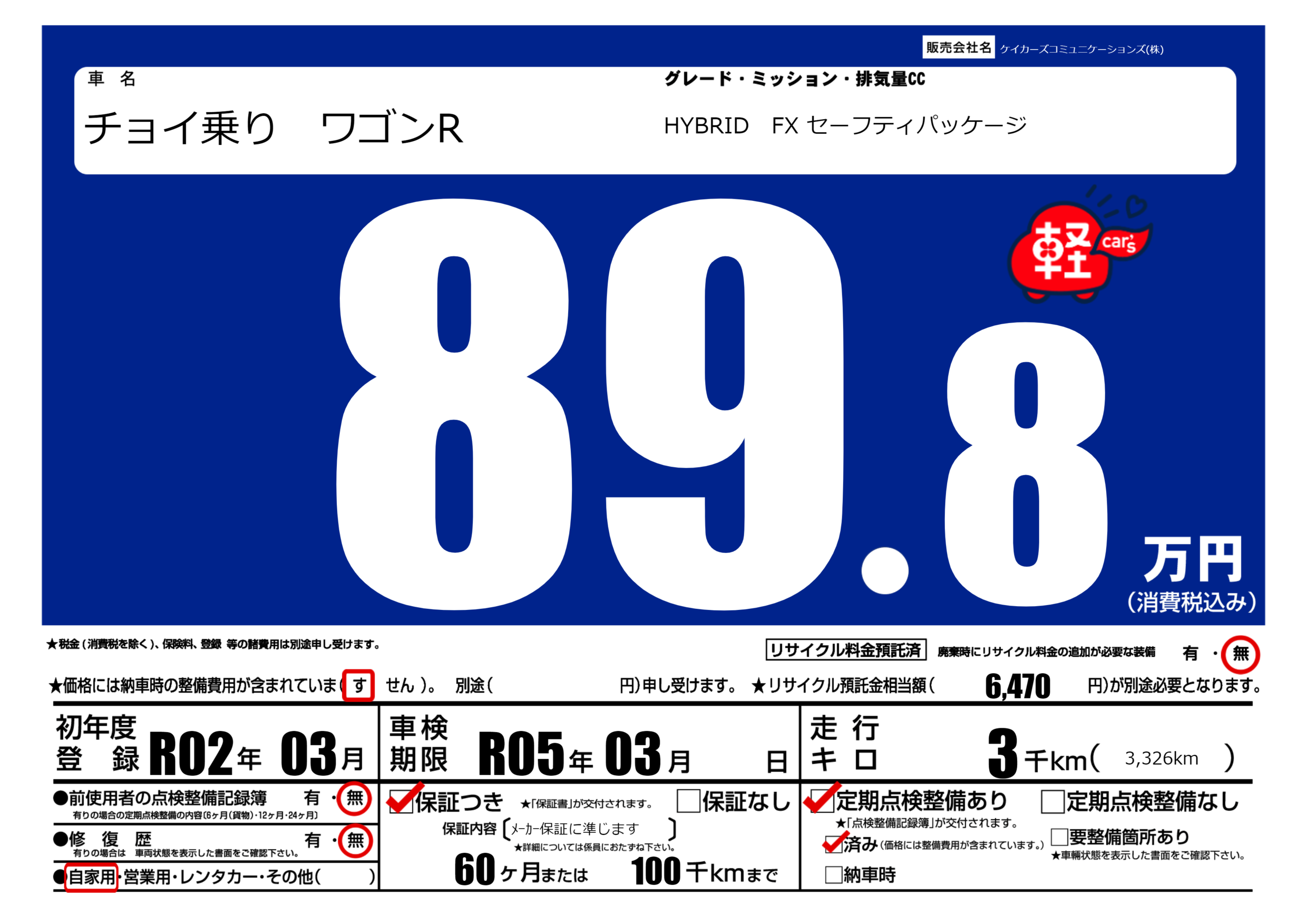 | 定期点検整備 | 定期点検整備あり 定期点検整備済み | ||