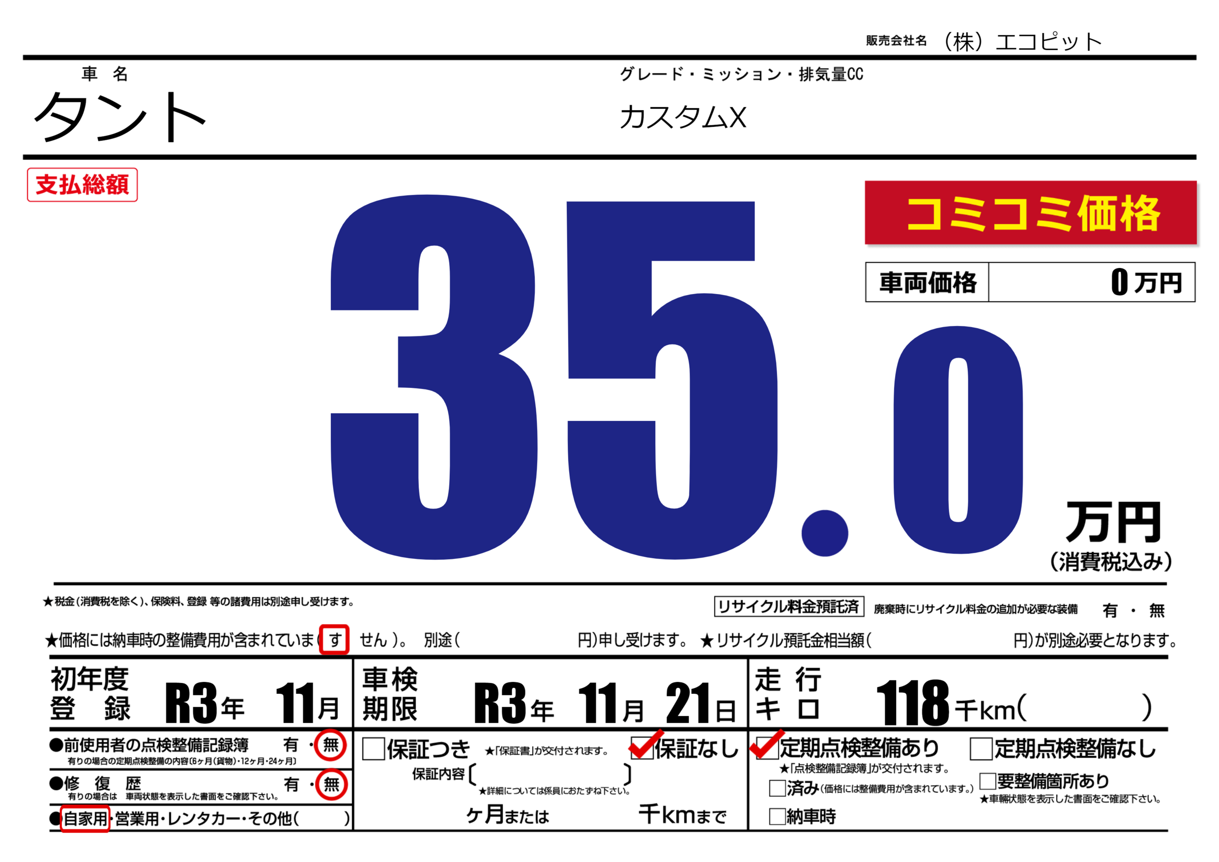 なし | リサイクル預託金相当額 | ( 0円)が別途必要 |
