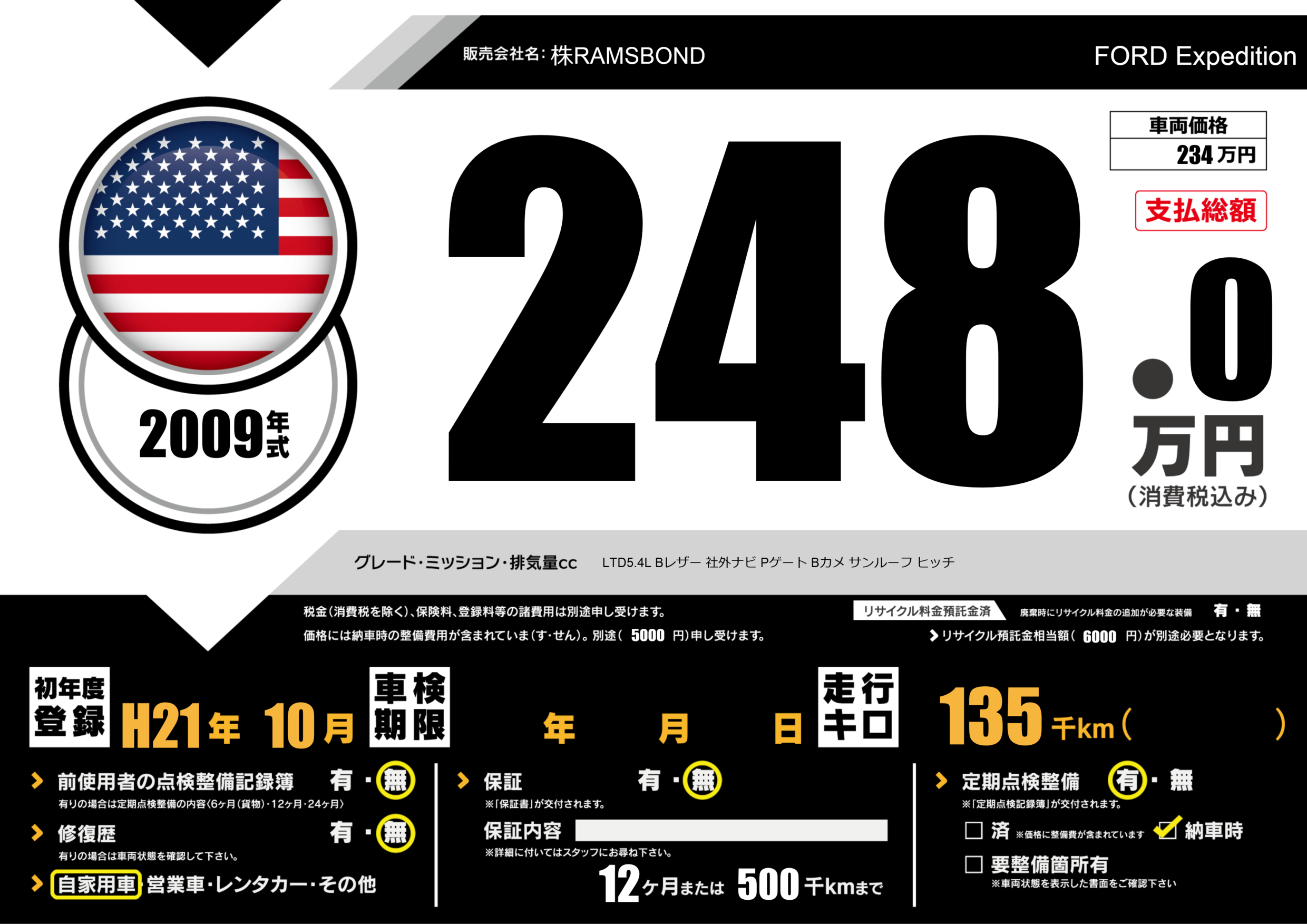 | 車名 | FORD Expedition | グレード ミッション 排気量 |