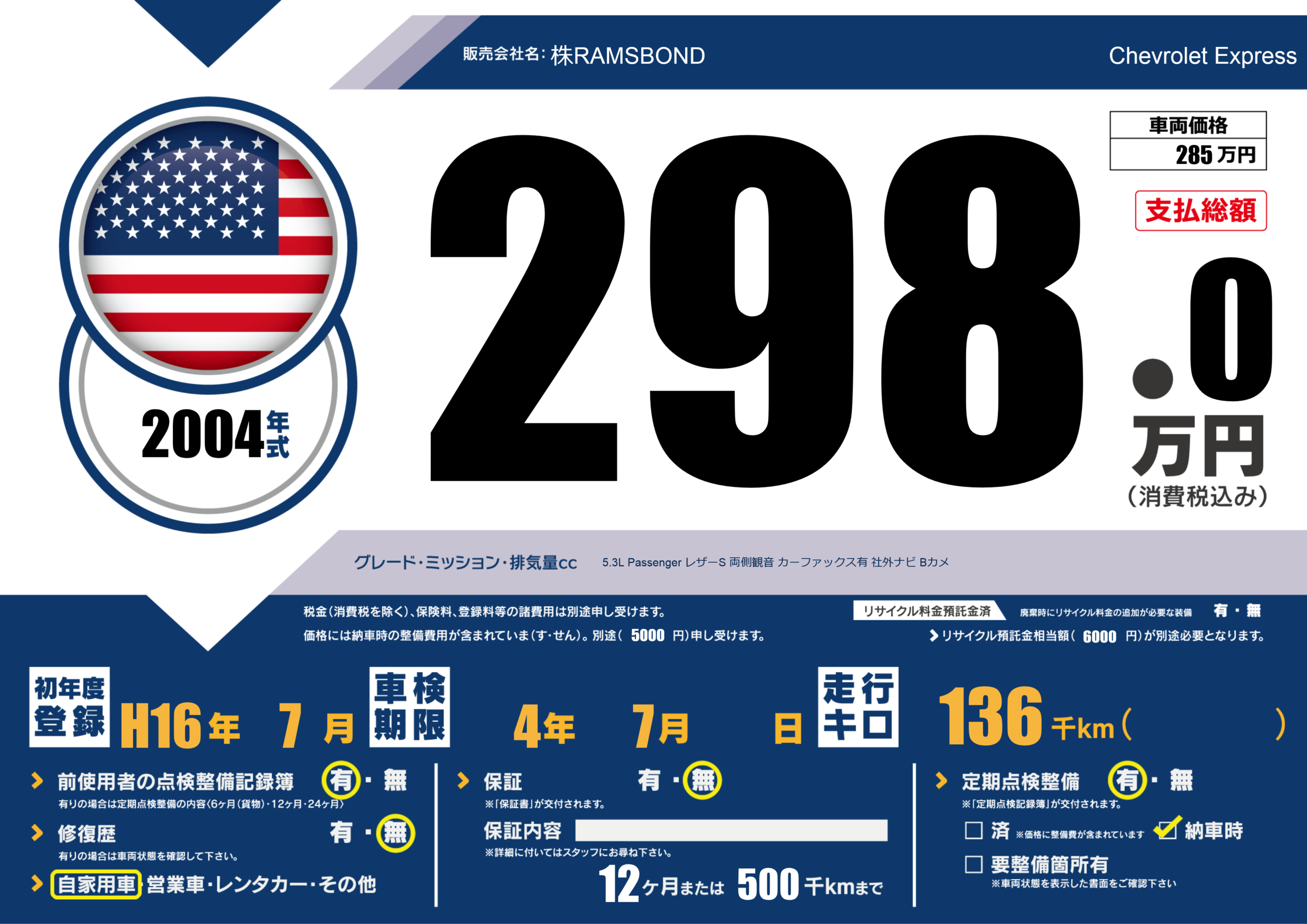 | 車名 | Chevrolet Express | グレード ミッション 排気量 |