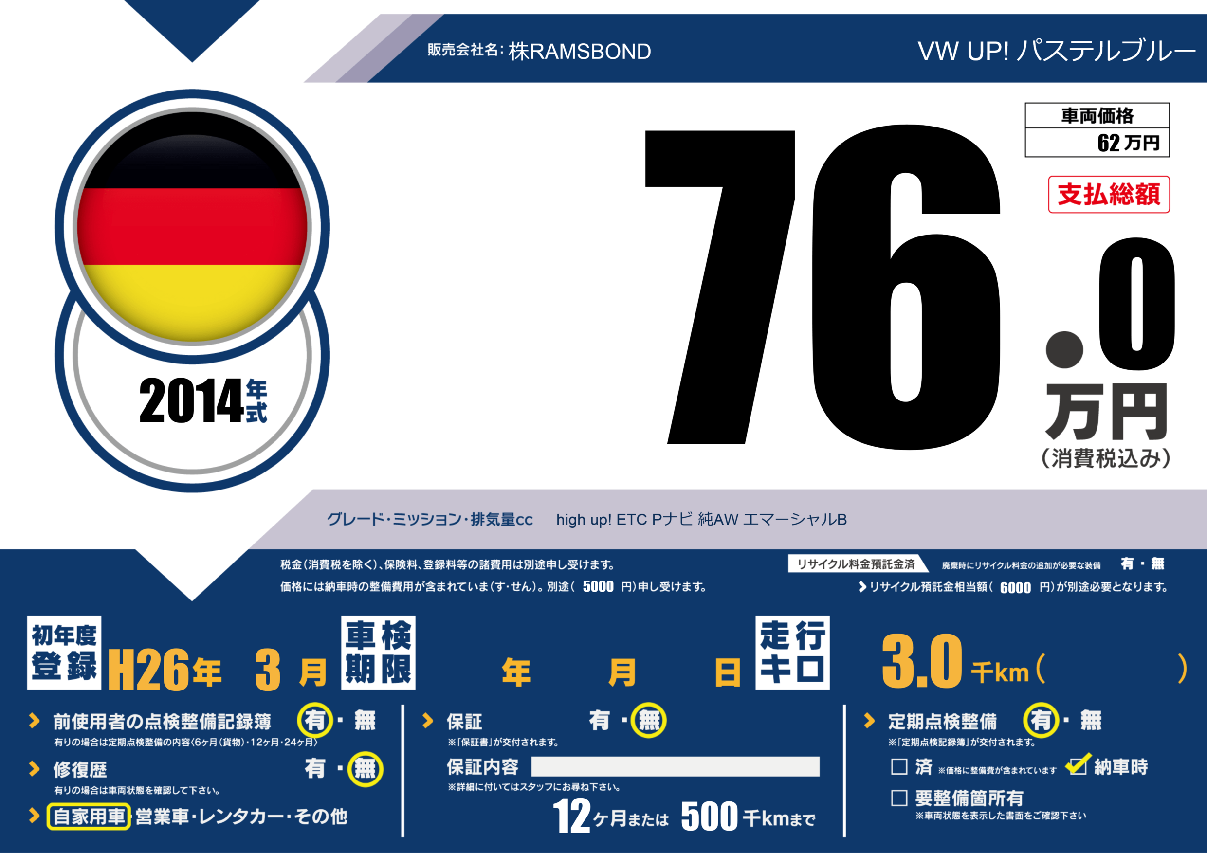 | 車名 | VW UP! パステルブルー | グレード ミッション 排気量 |
