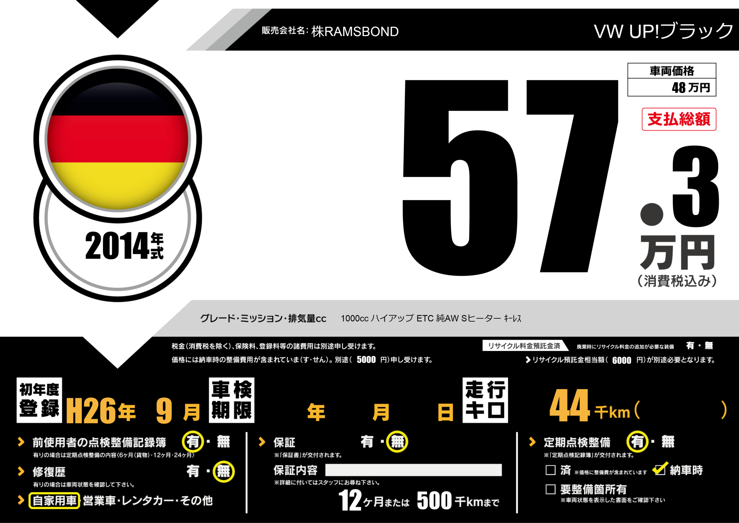 | 車名 | VW UP!ブラック | グレード ミッション 排気量 |