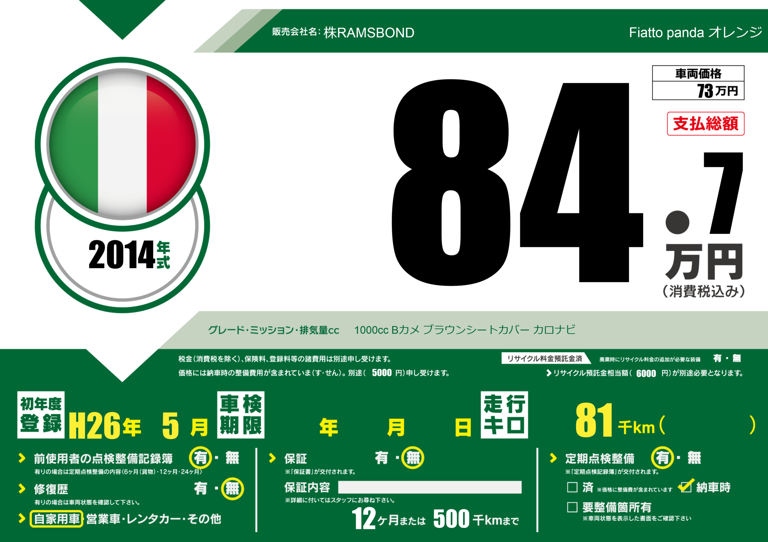 | 車名 | Fiatto panda オレンジ | グレード ミッション 排気量 |