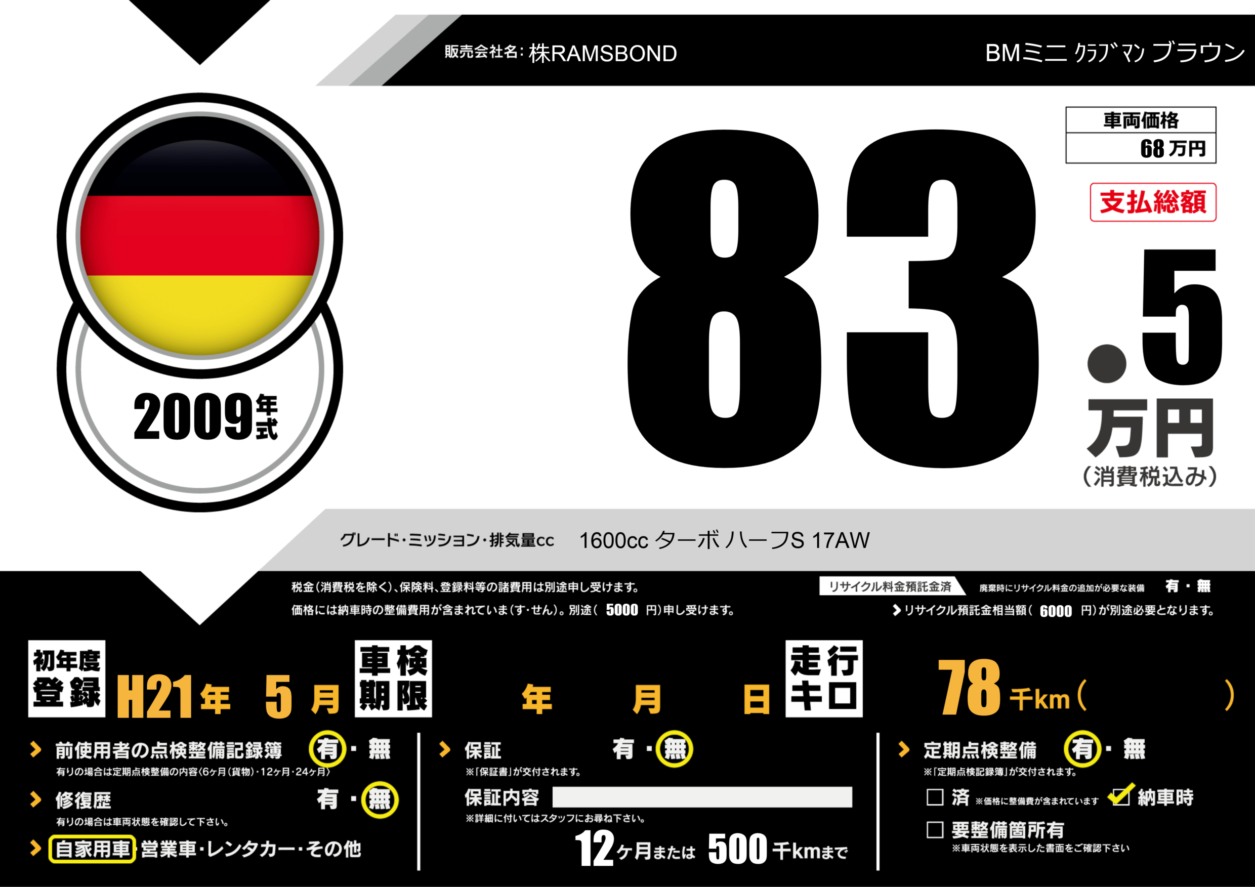 | 車名 | BMミニ クラブマン ブラウン | グレード ミッション 排気量 |