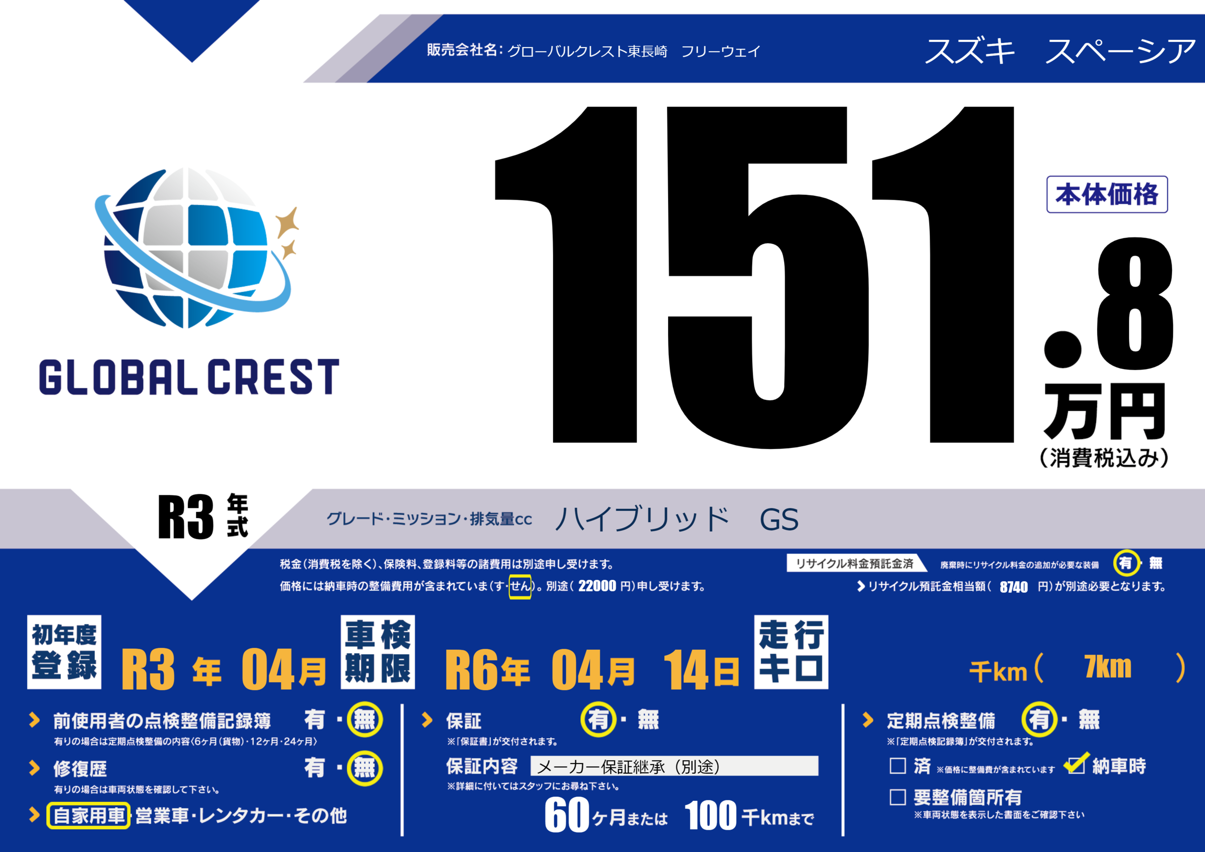 | 車名 | スズキ スペーシア | グレード ミッション 排気量 |