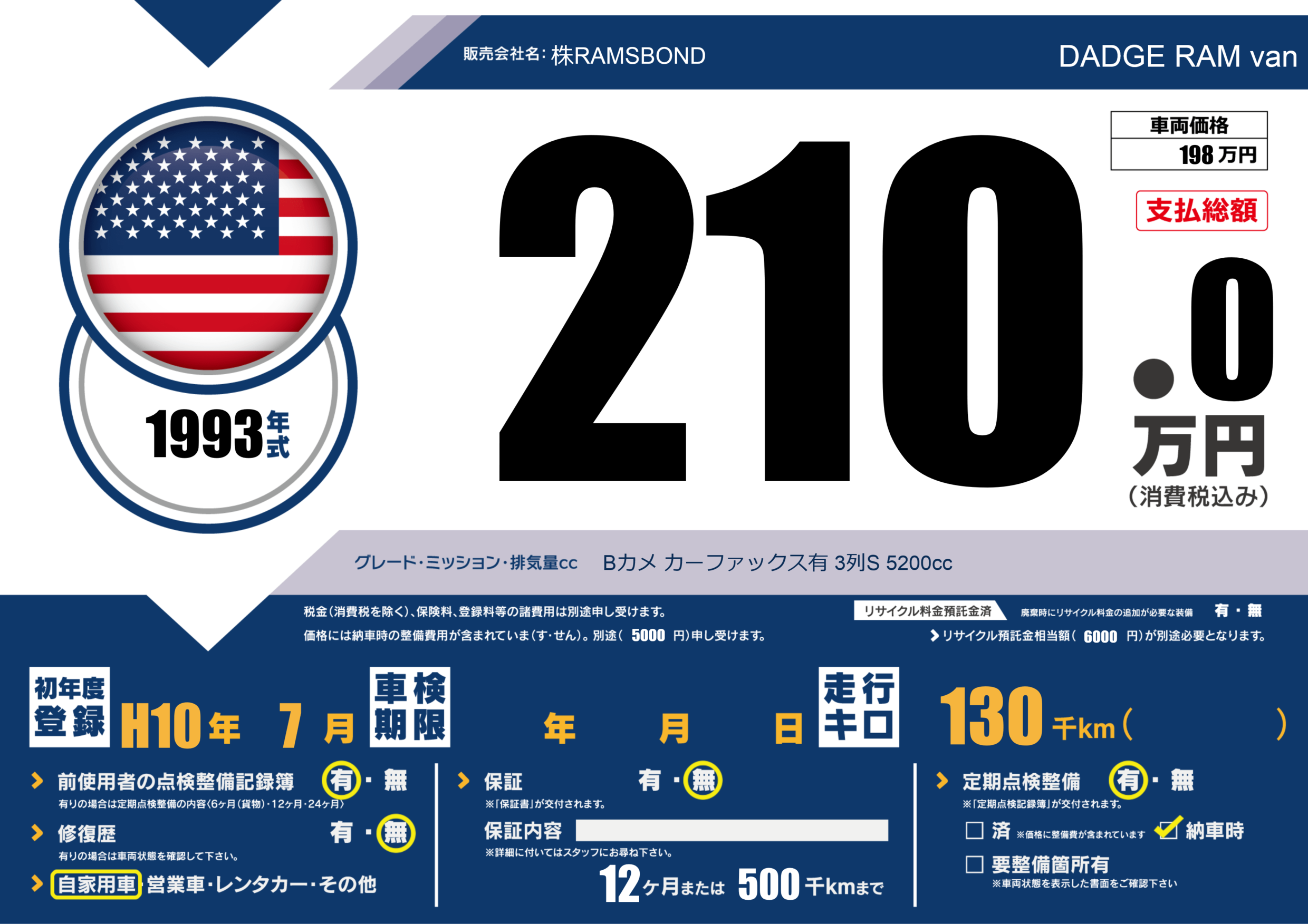 | 車名 | DADGE RAM van | グレード ミッション 排気量 |