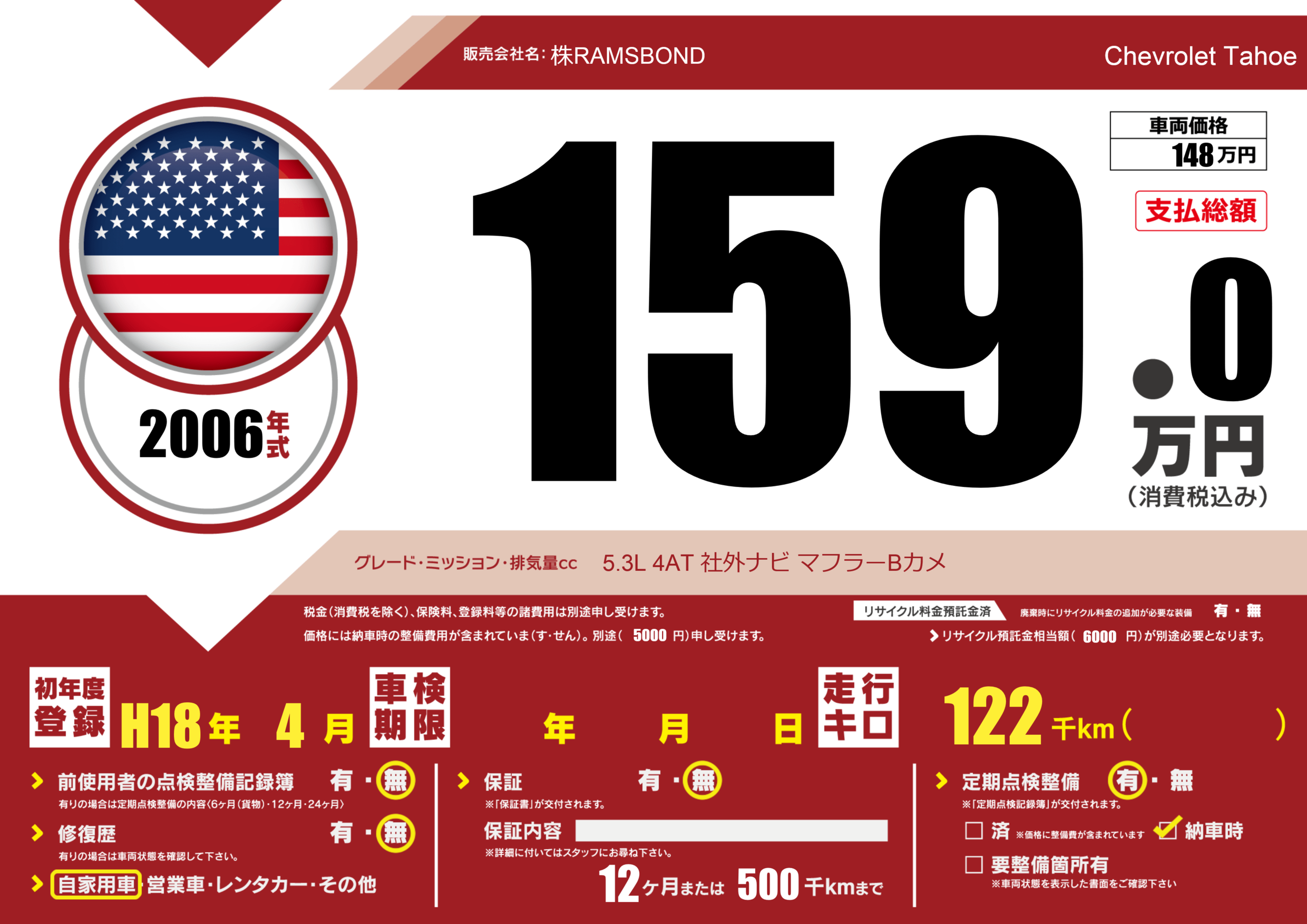 | 車名 | Chevrolet Tahoe | グレード ミッション 排気量 |