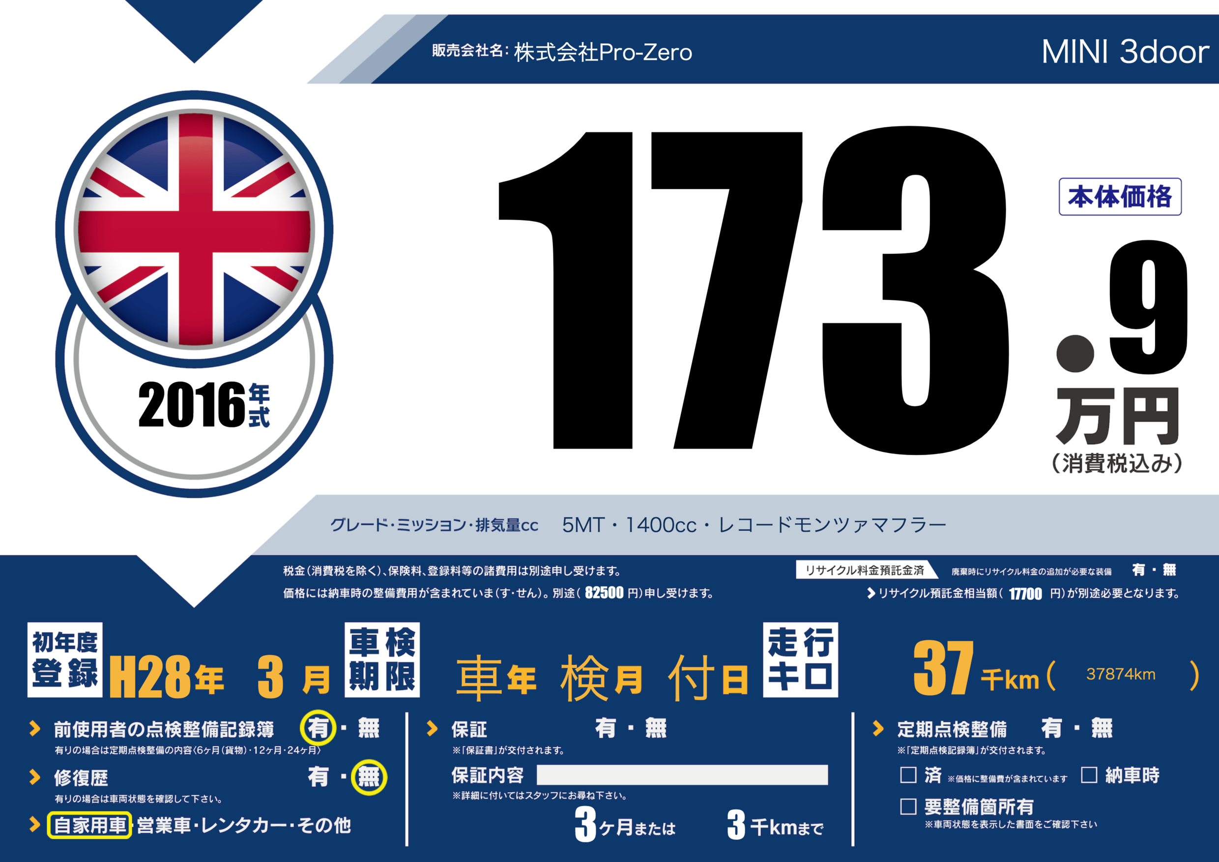 | 車名 | MINI 3door | グレード ミッション 排気量 |