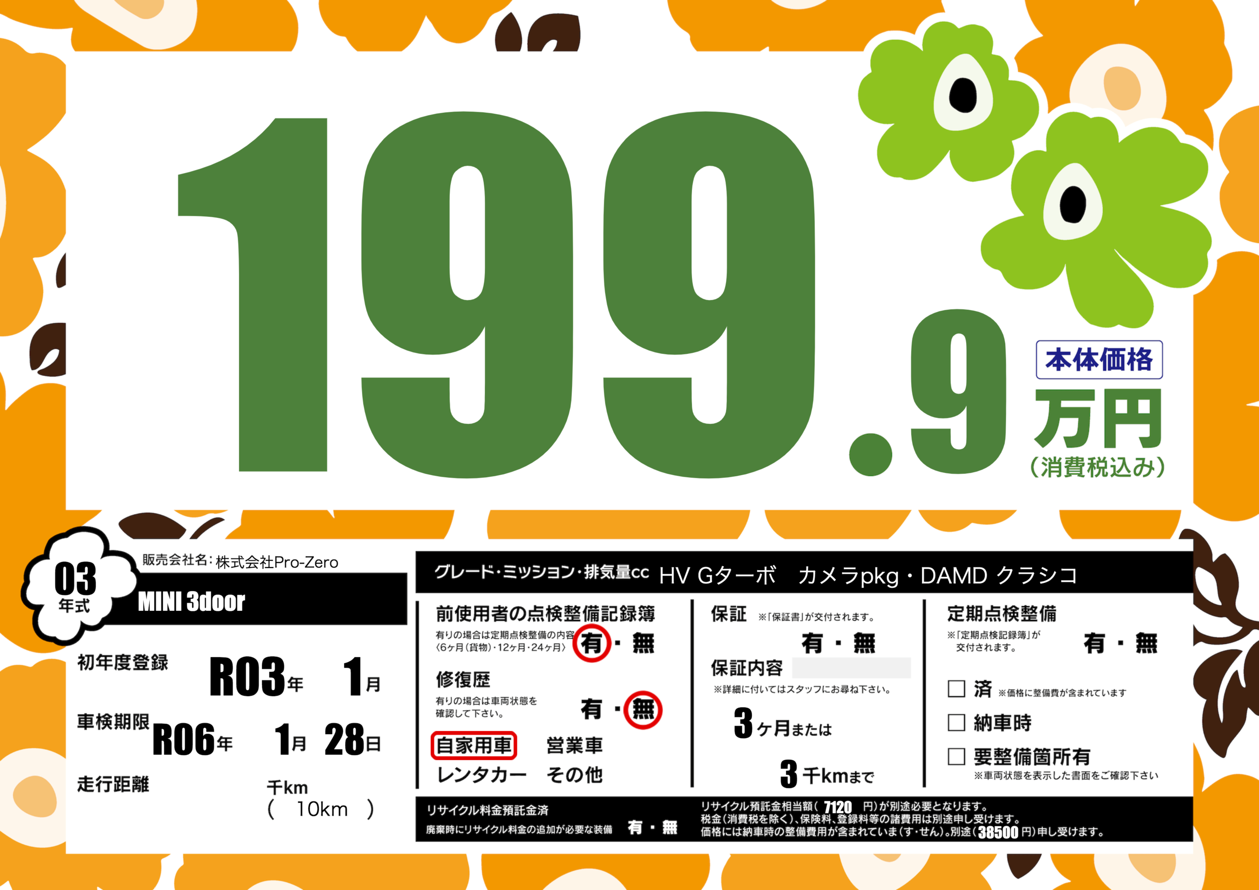 | 車名 | MINI 3door | グレード ミッション 排気量 |