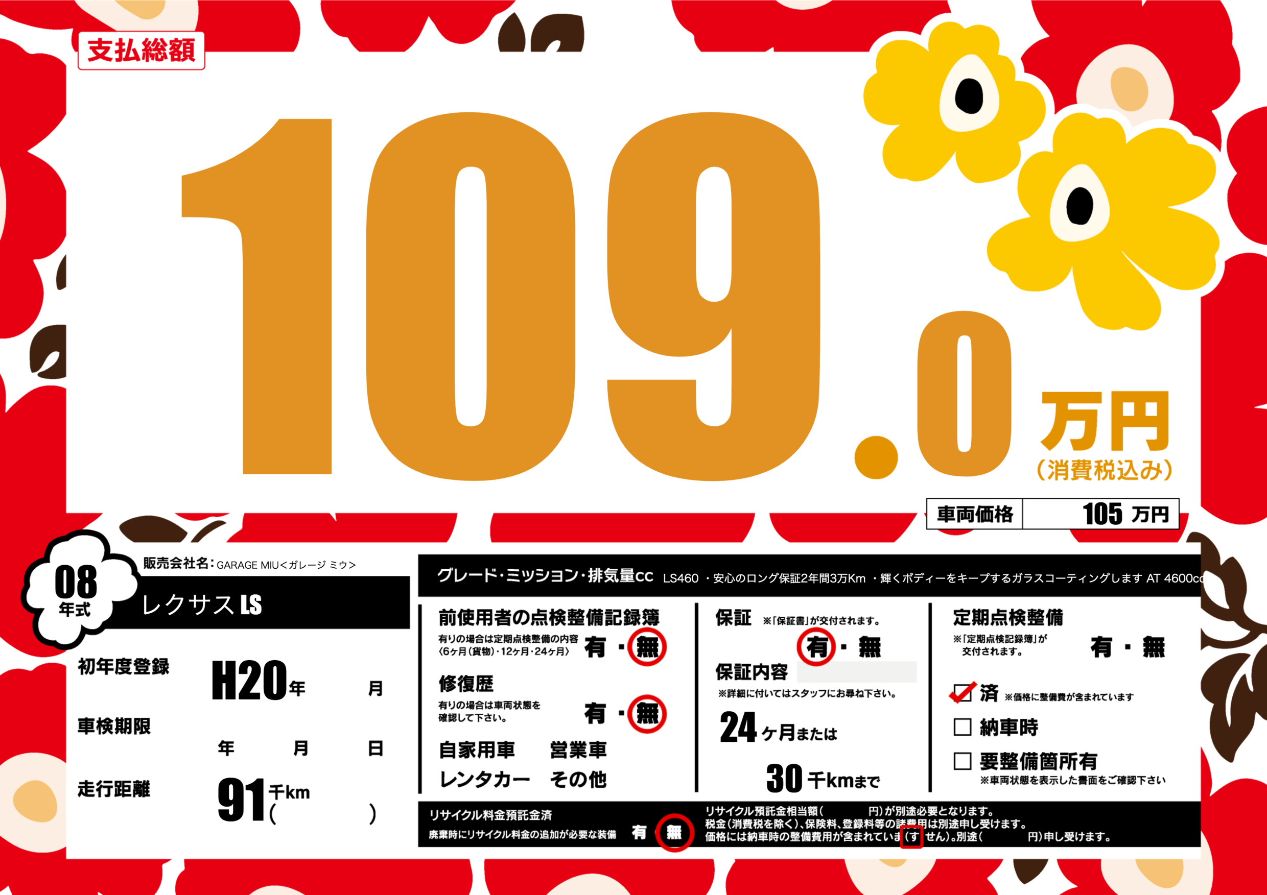 | 車名 | レクサス LS | グレード ミッション 排気量 |