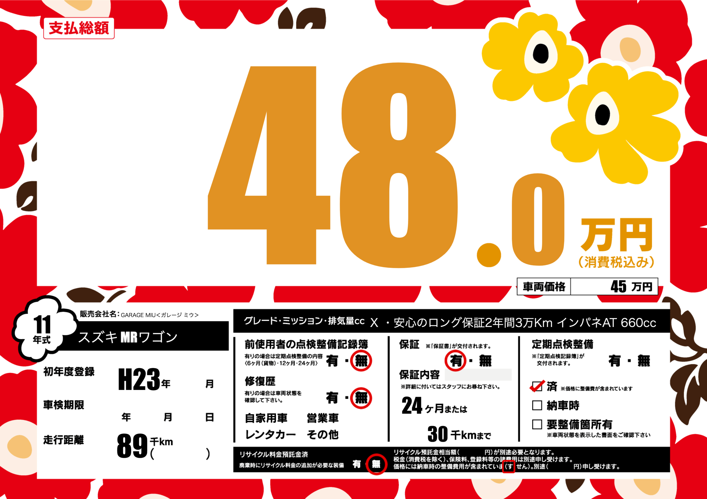 | 定期点検整備 | 定期点検整備済み | ||