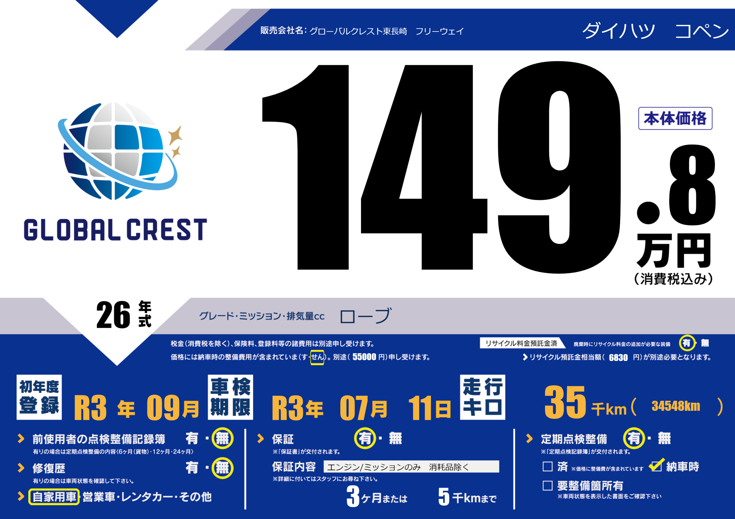 | 車名 | ダイハツ コペン | グレード ミッション 排気量 |