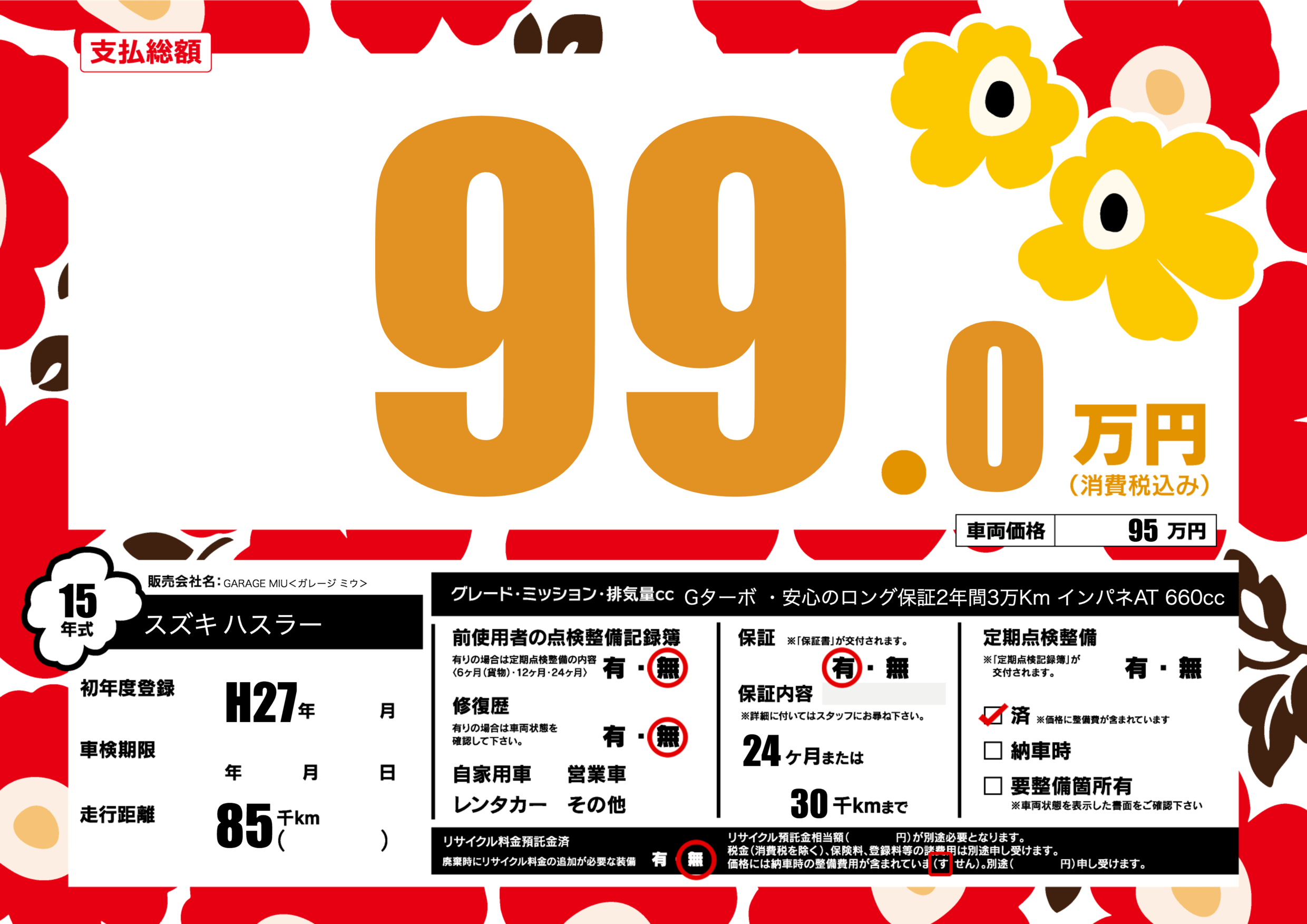 | 車名 | スズキ ハスラー | グレード ミッション 排気量 |