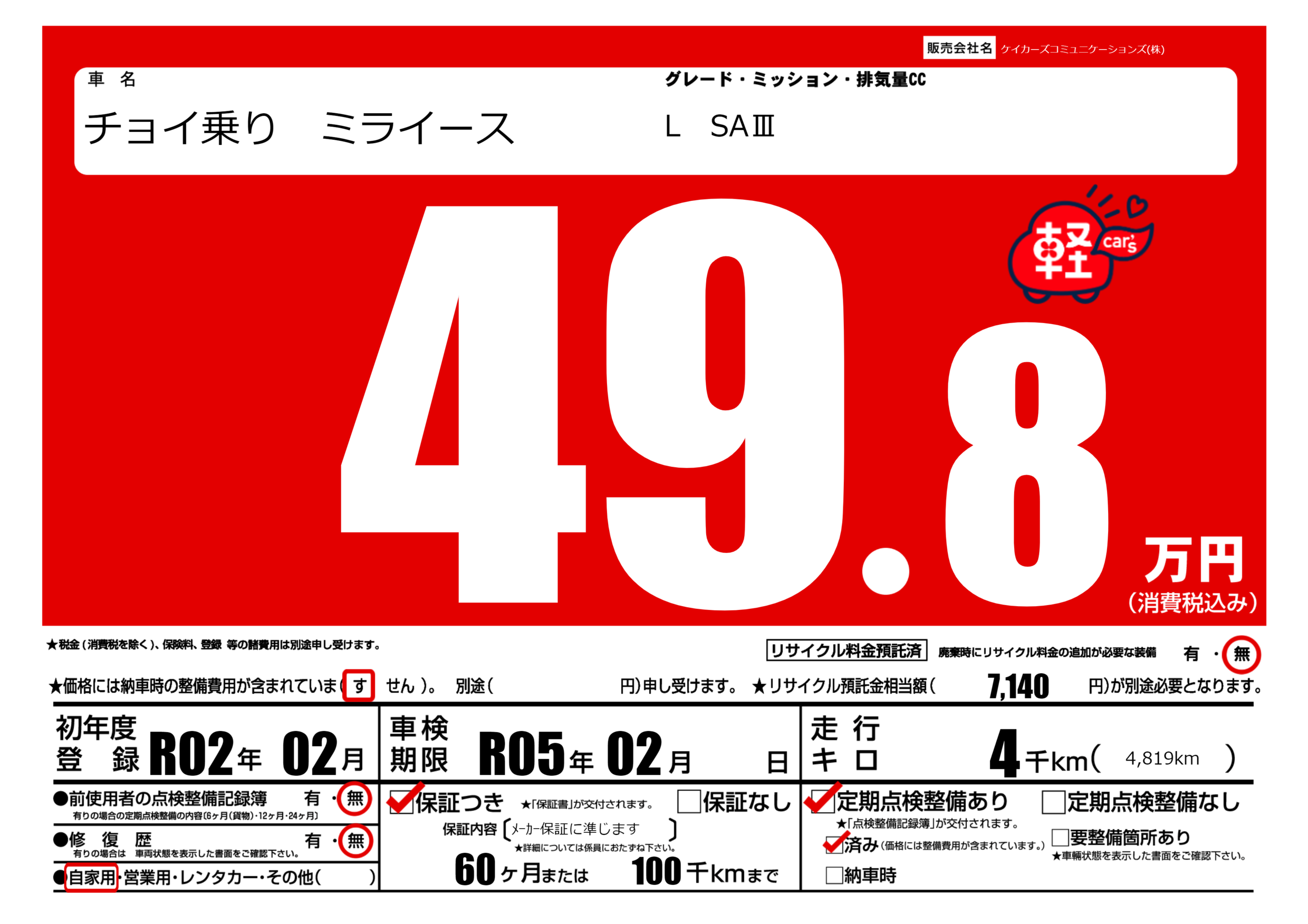 | 定期点検整備 | 定期点検整備あり 定期点検整備済み | ||
