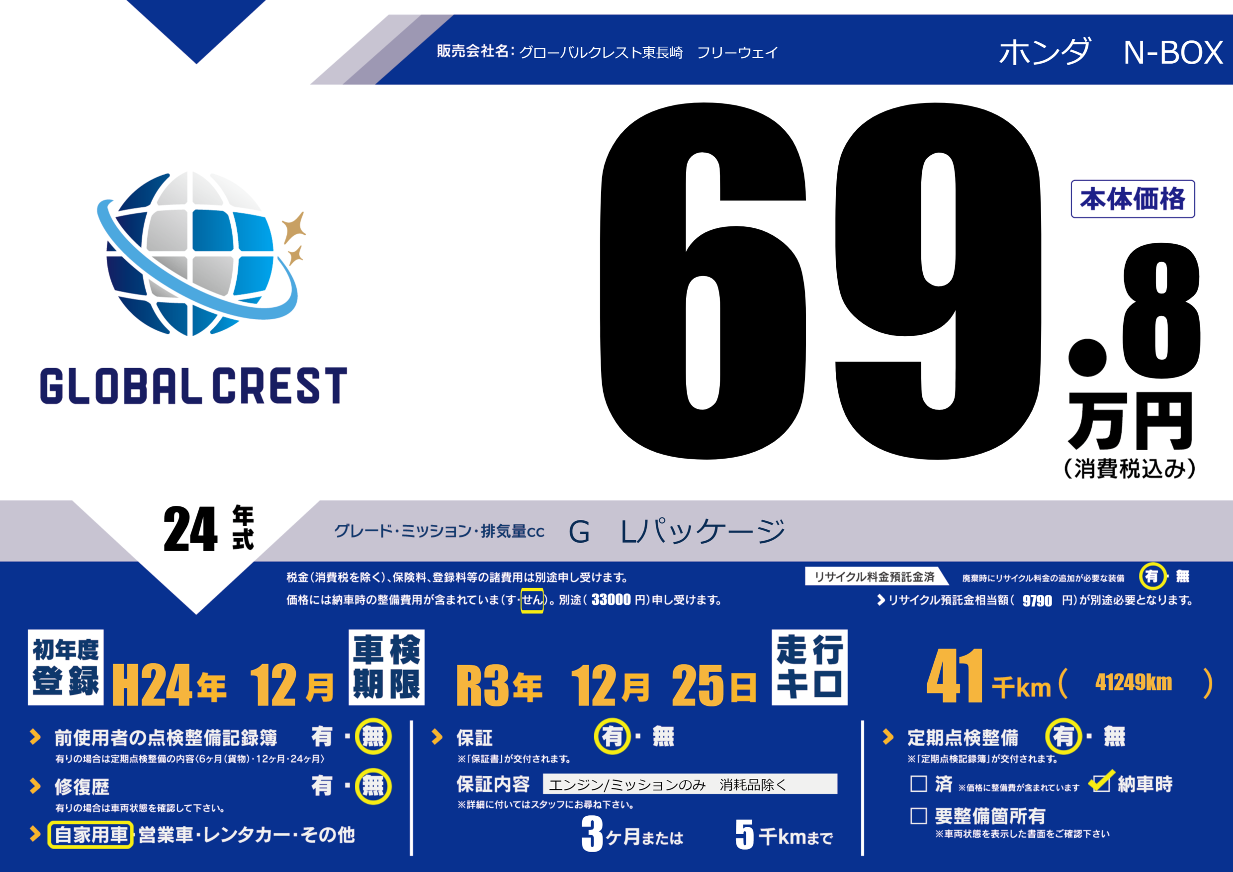| 車名 | ホンダ N-BOX | グレード ミッション 排気量 |