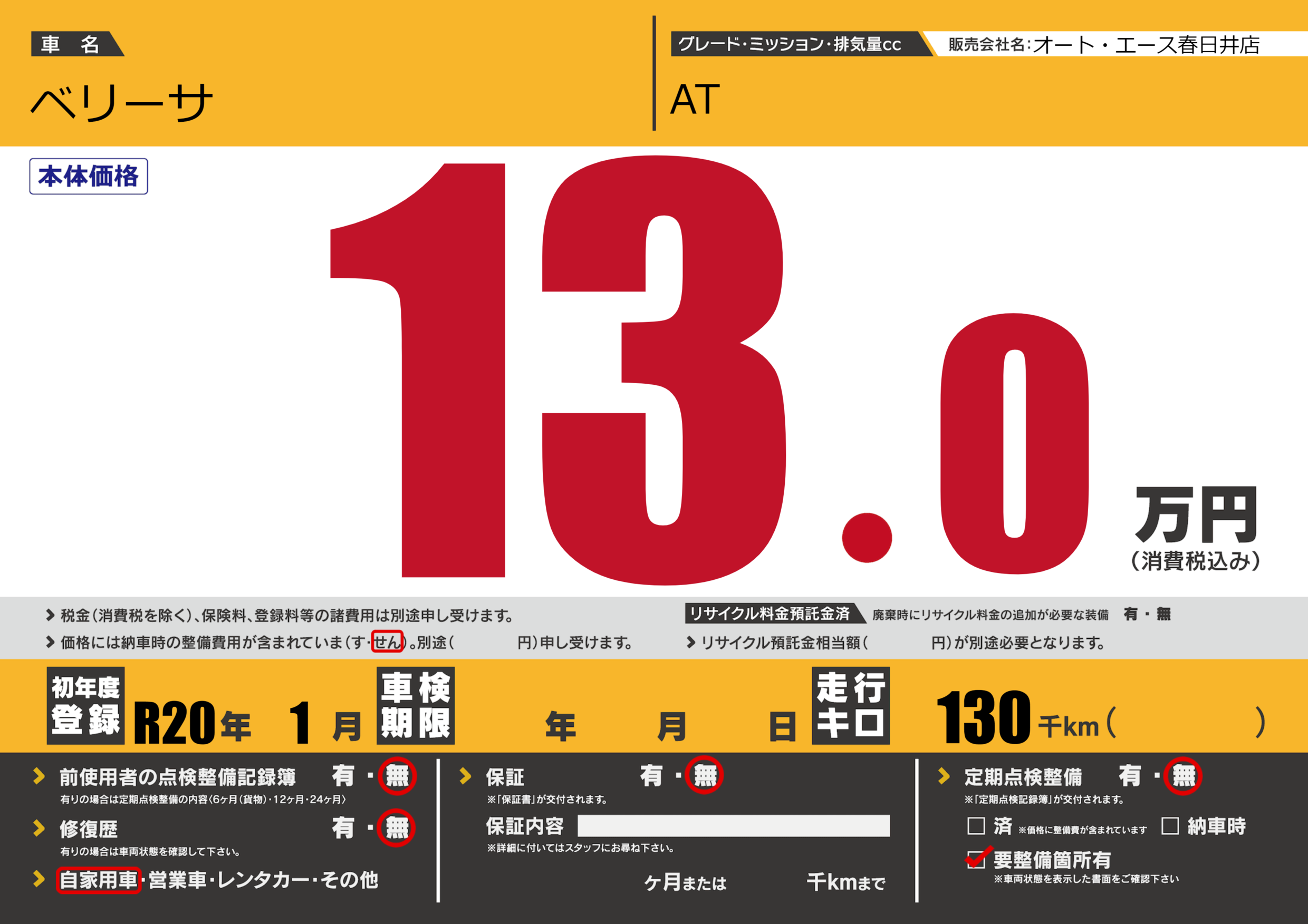 | 車名 | ベリーサ | グレード ミッション 排気量 |