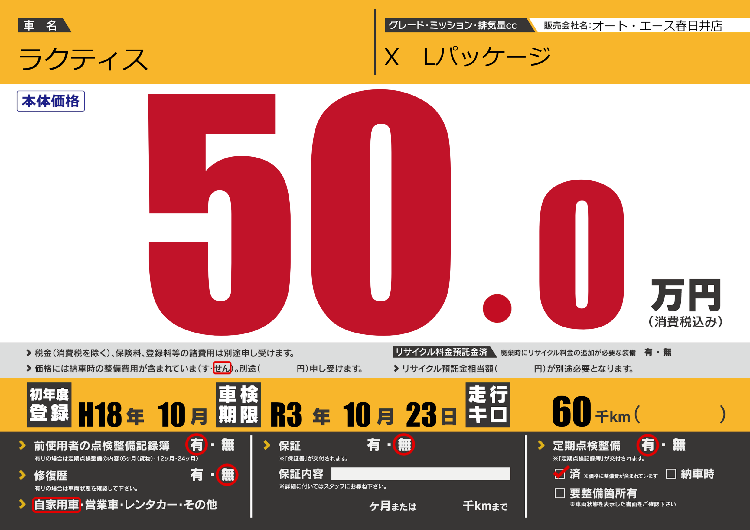 | 車名 | ラクティス | グレード ミッション 排気量 |