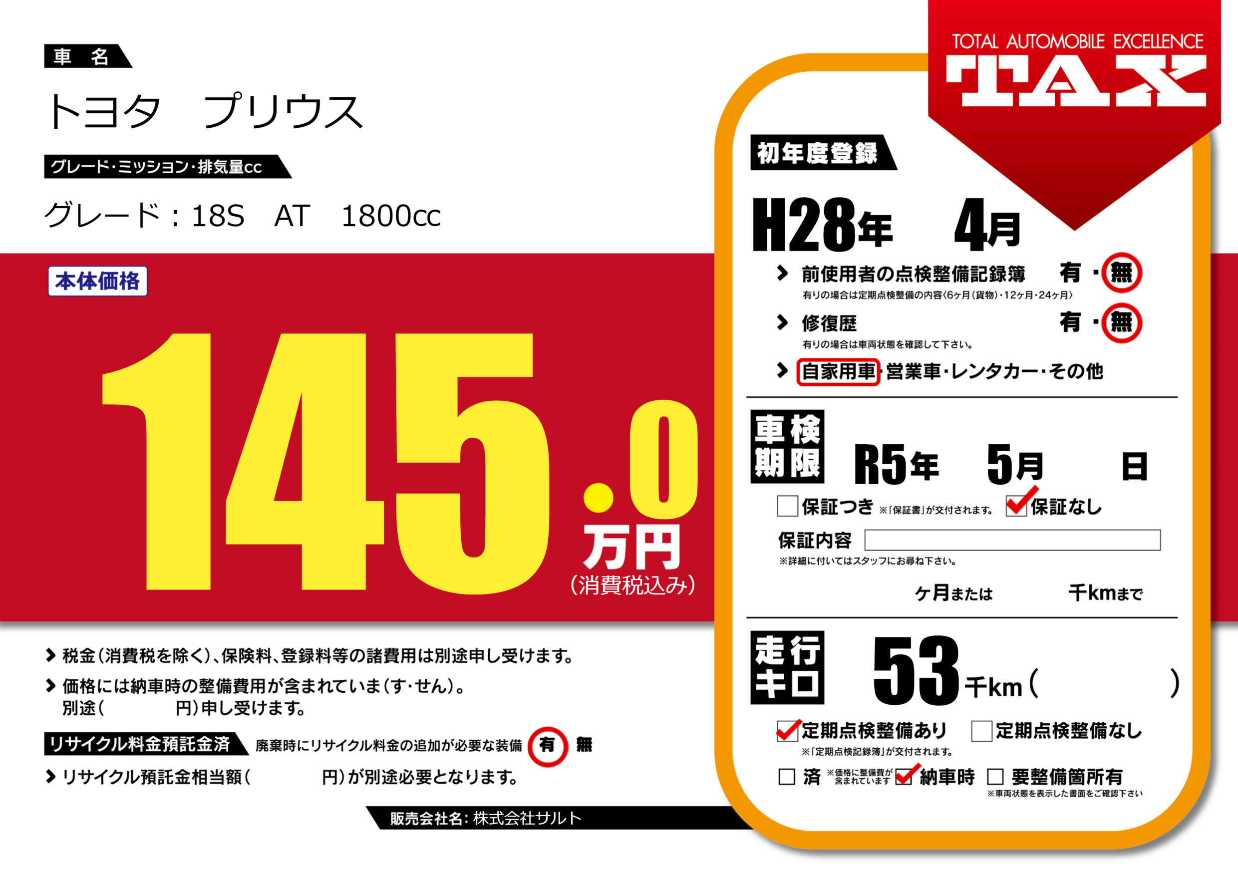 なし | 車検制限 | R5年5月---月 |