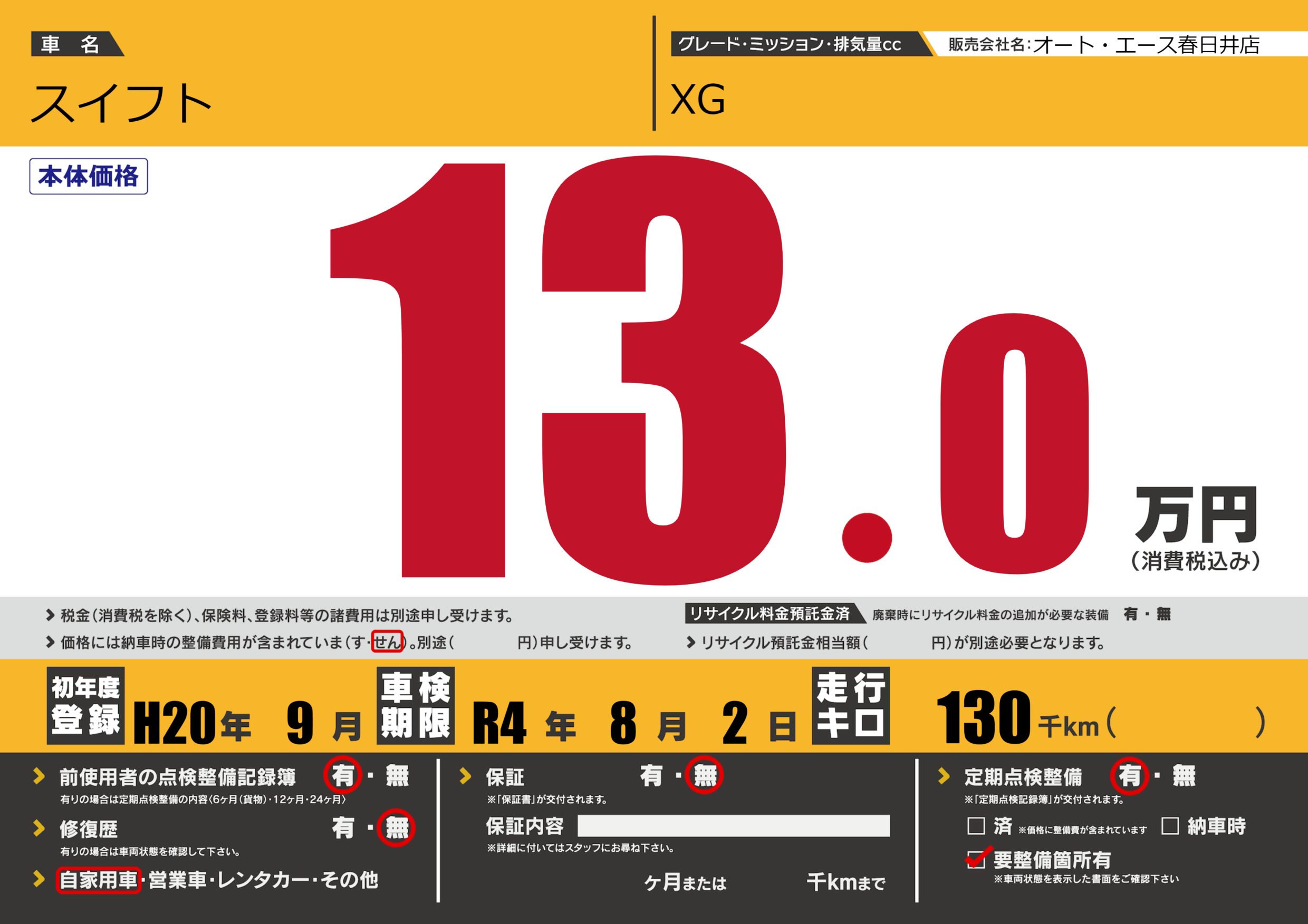 | 車名 | スイフト | グレード ミッション 排気量 |