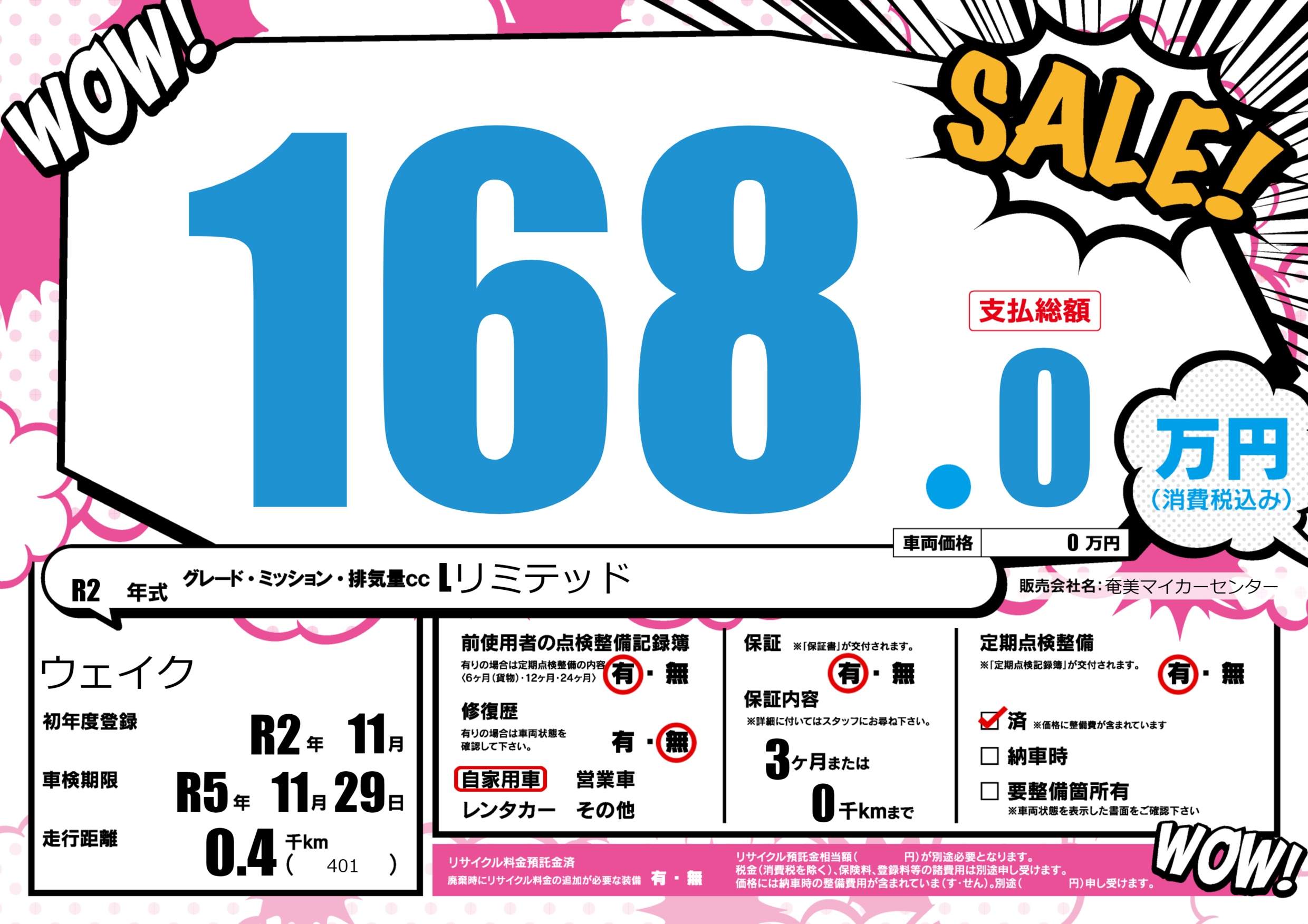 | 走行キロ | - | 初年度登録 | R2年11月 |