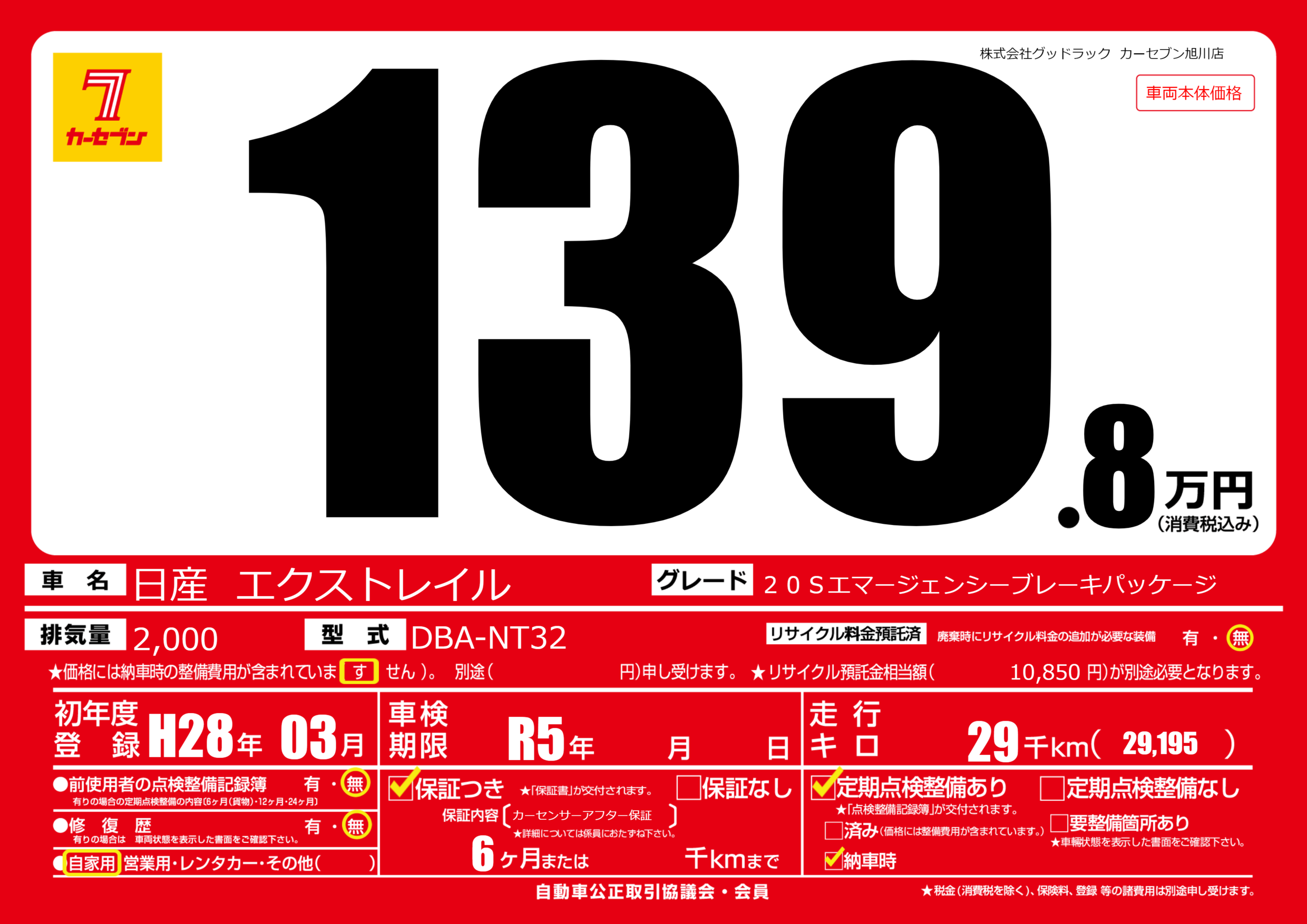 | 車名 | 日産 エクストレイル | グレード ミッション 排気量 |