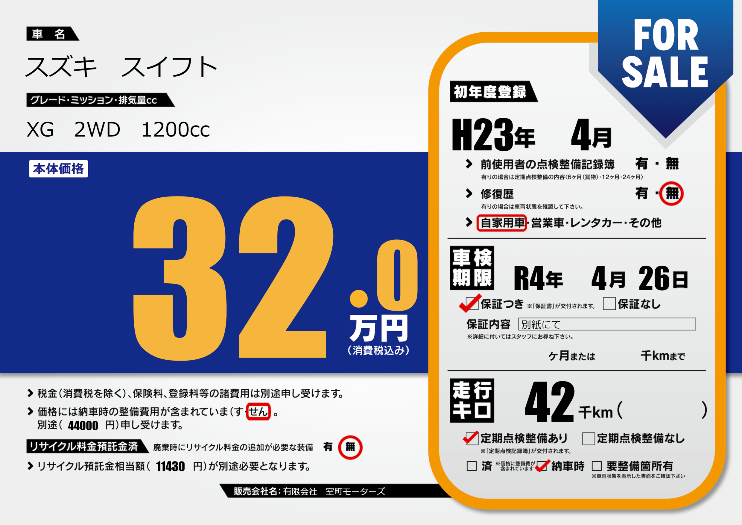 | 車名 | スズキ スイフト | グレード ミッション 排気量 |